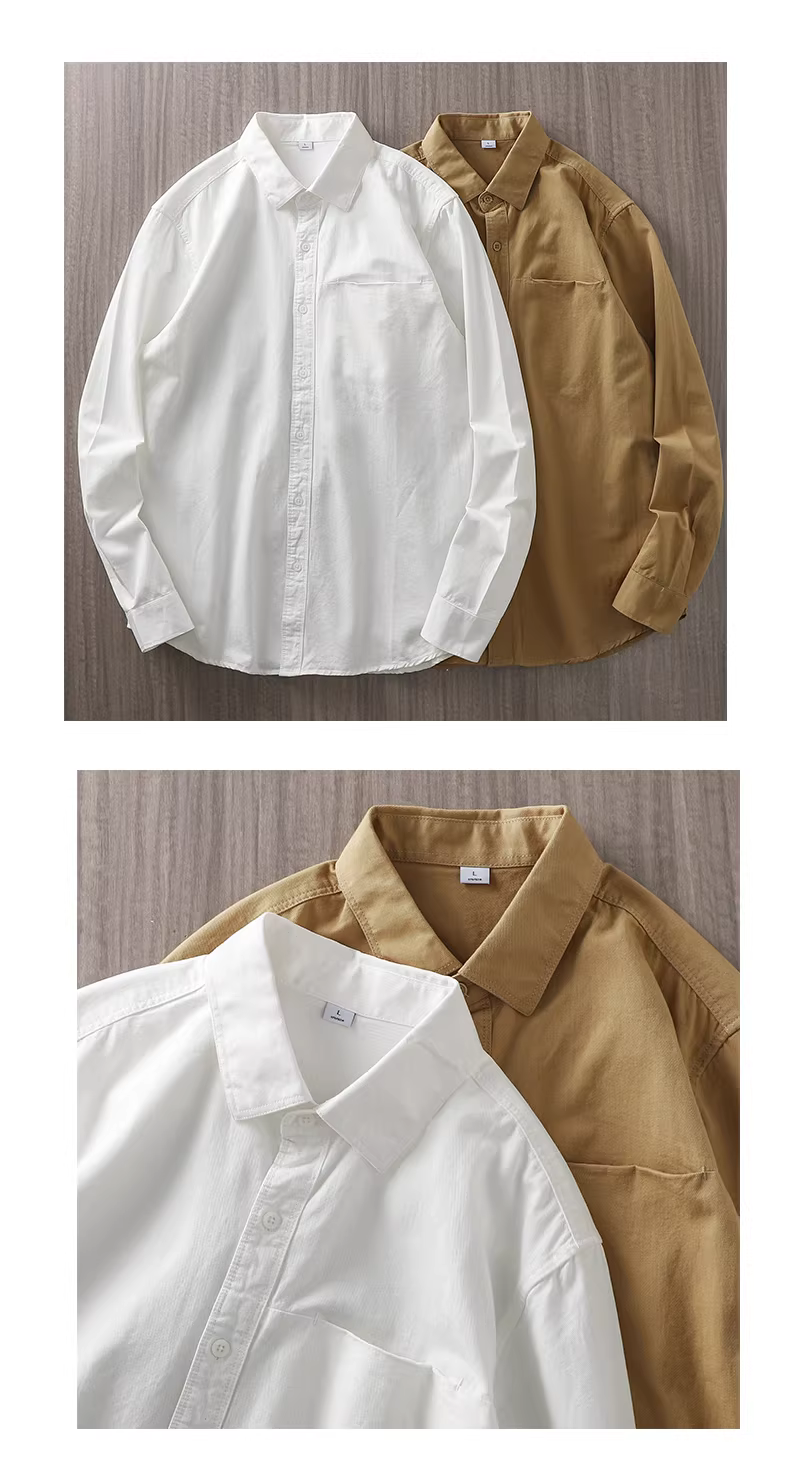 Áo sơ mi nam dài tay chất liệu cotton 100%, dày 350G, thích hợp cho mùa xuân và mùa thu, kiểu dáng casual, có túi, cổ sơ mi, màu trắng.