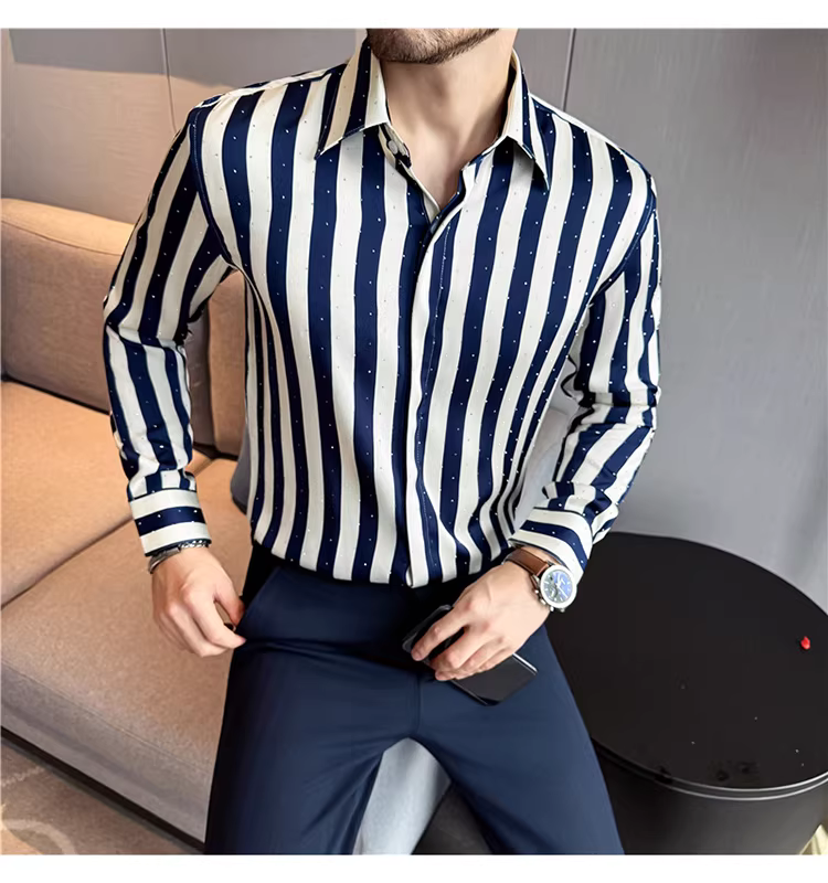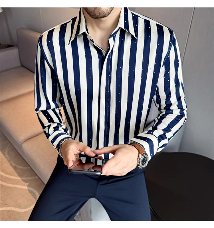 - Áo sơ mi nam đính đá Gypsophila, sọc, tay dài, kiểu mới 2025, chất liệu cao cấp, thiết kế dáng đẹp, áo cài khuy giấu.