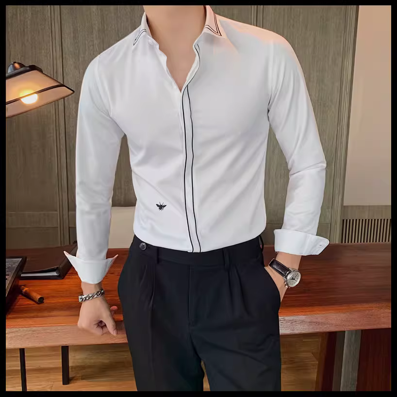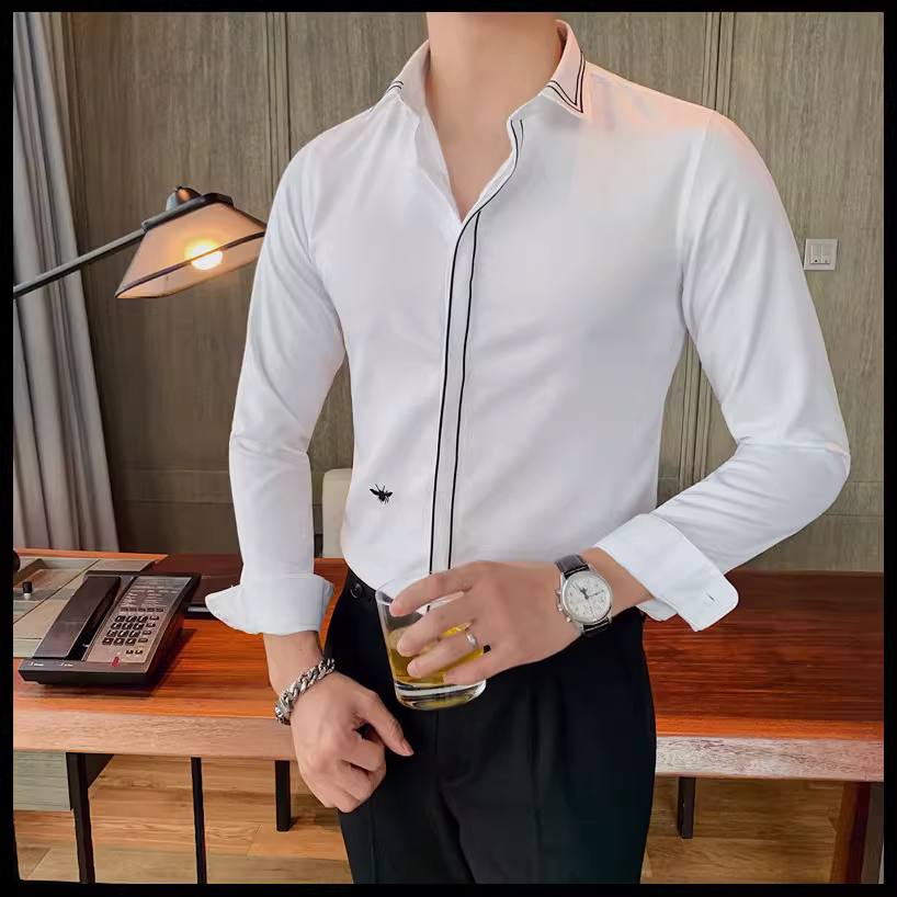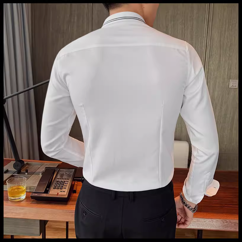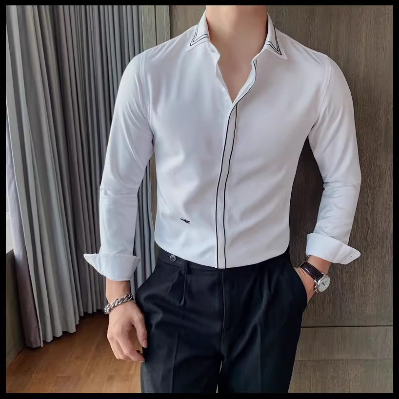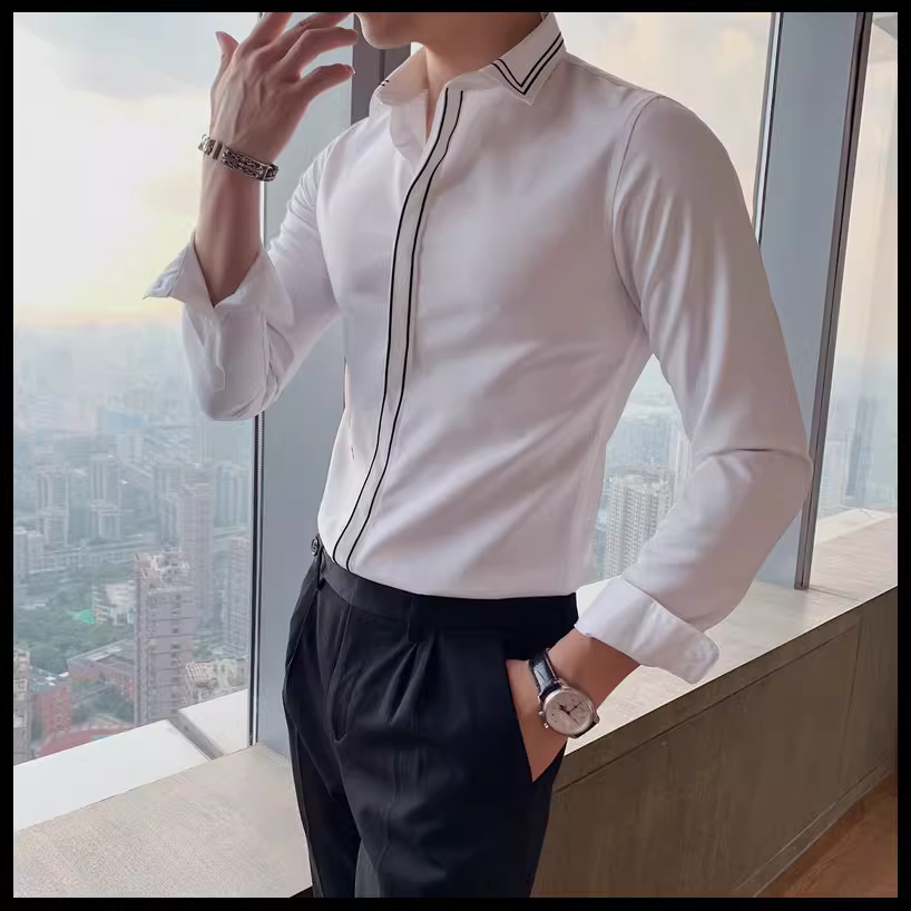 - Áo sơ mi nam kẻ sọc phong cách Anh quốc mới mùa xuân thu, kiểu Hàn Quốc, thời trang, lịch lãm, dáng ôm, màu trắng