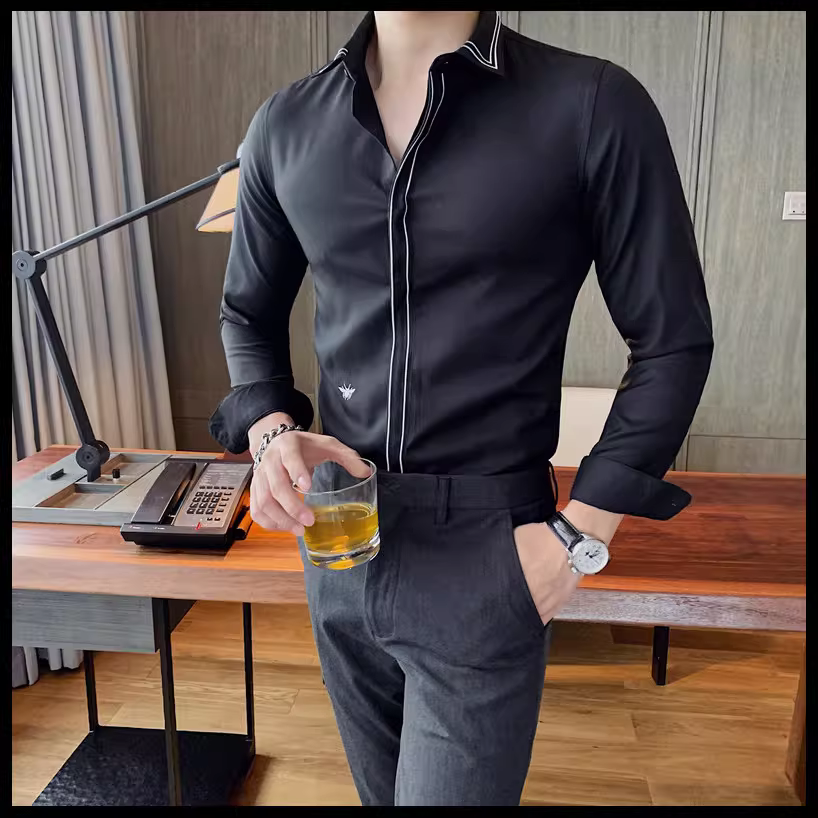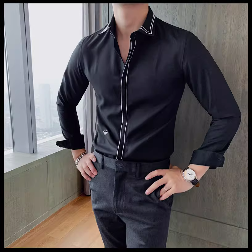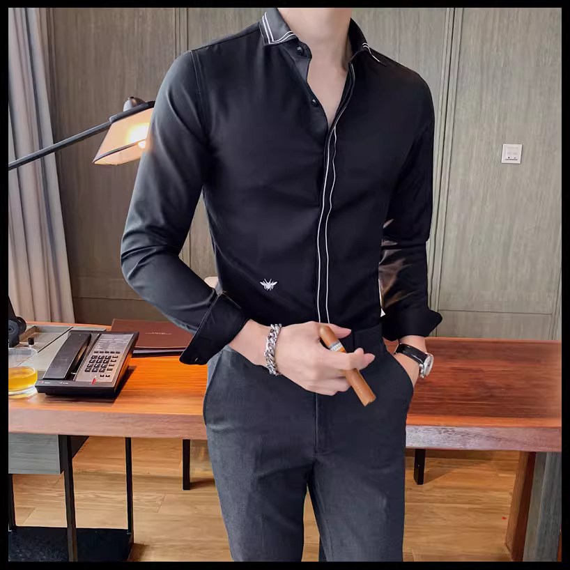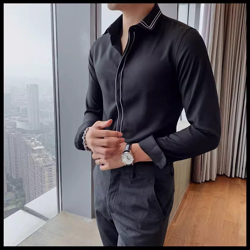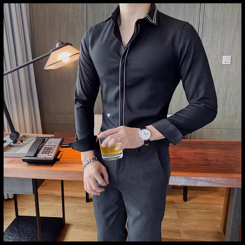 - Áo sơ mi nam kẻ sọc phong cách Anh quốc mới mùa xuân thu, kiểu Hàn Quốc, thời trang, lịch lãm, dáng ôm, màu trắng