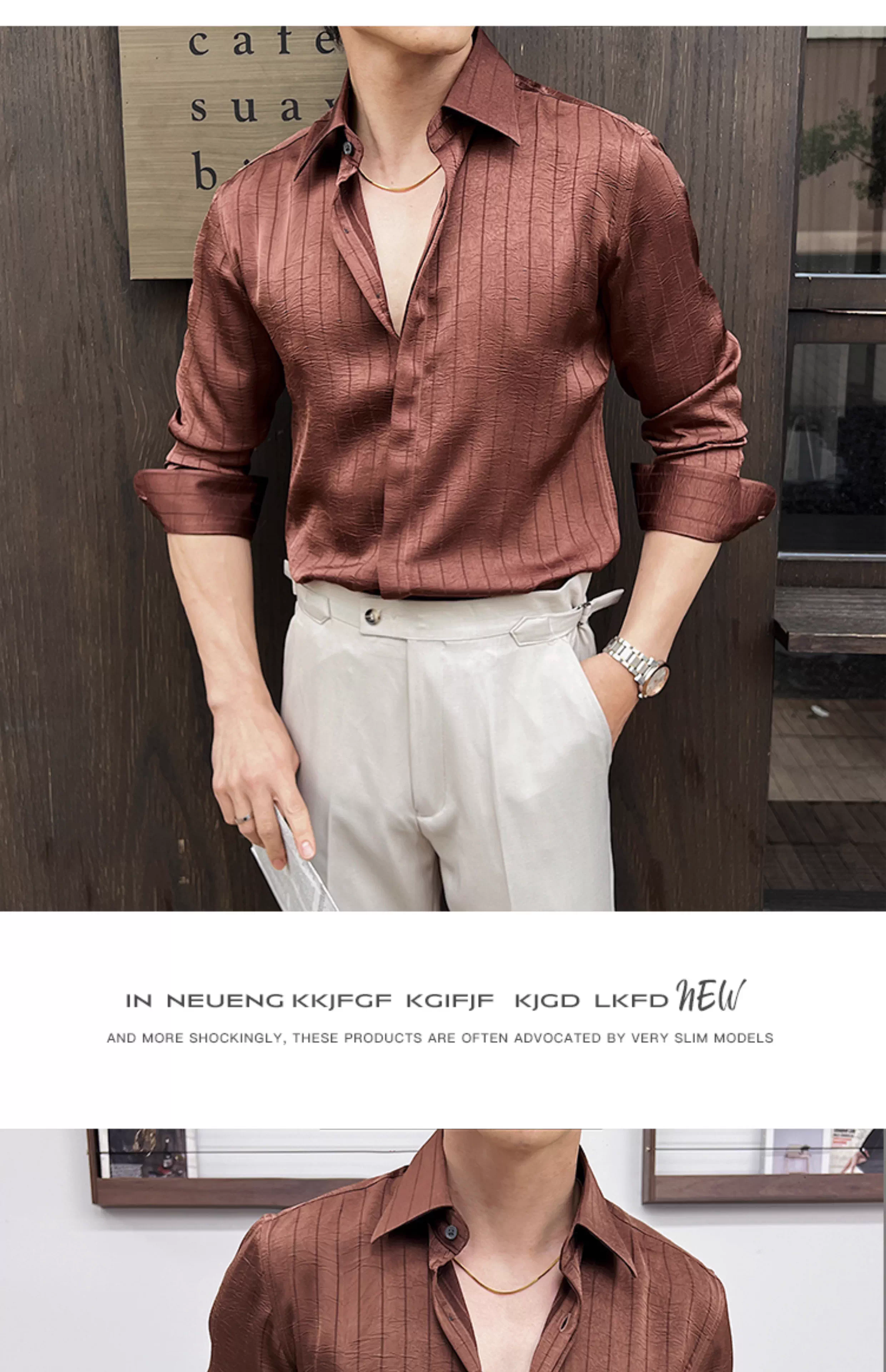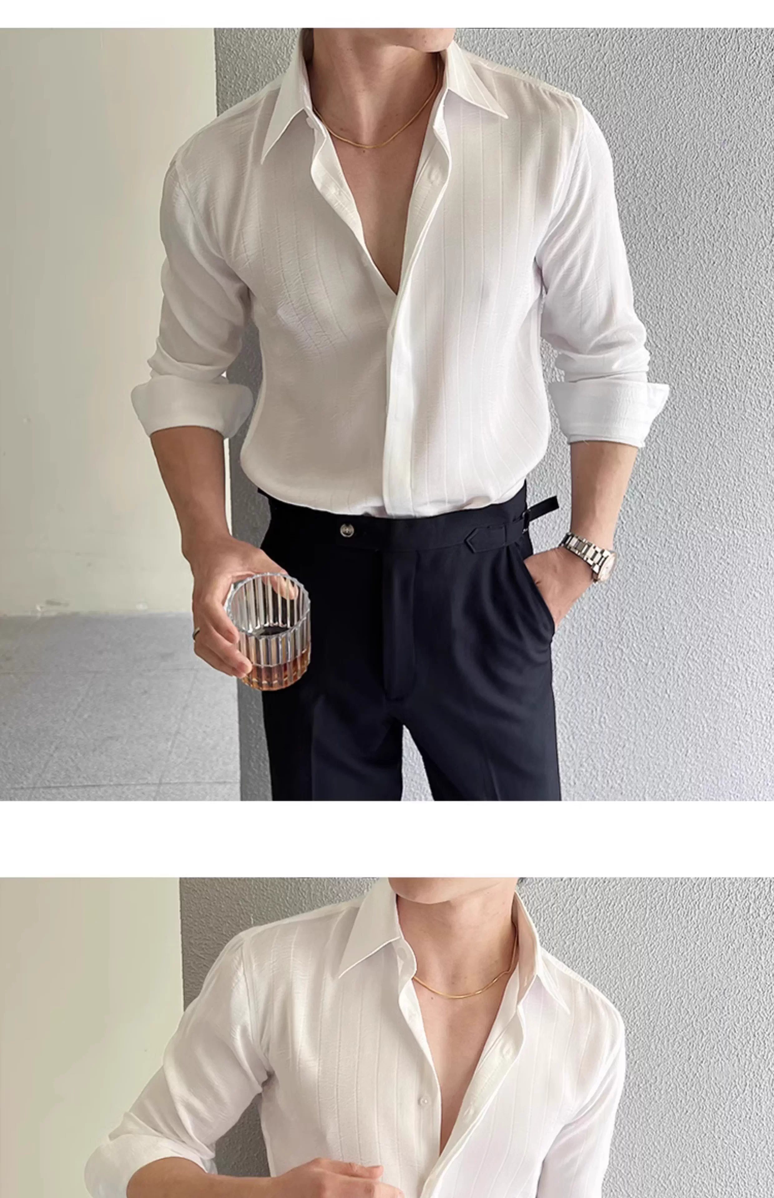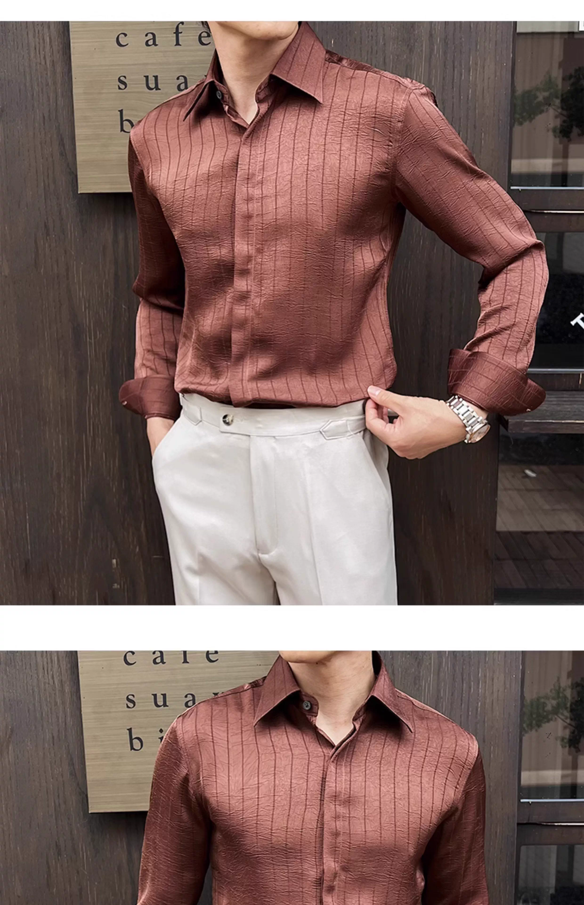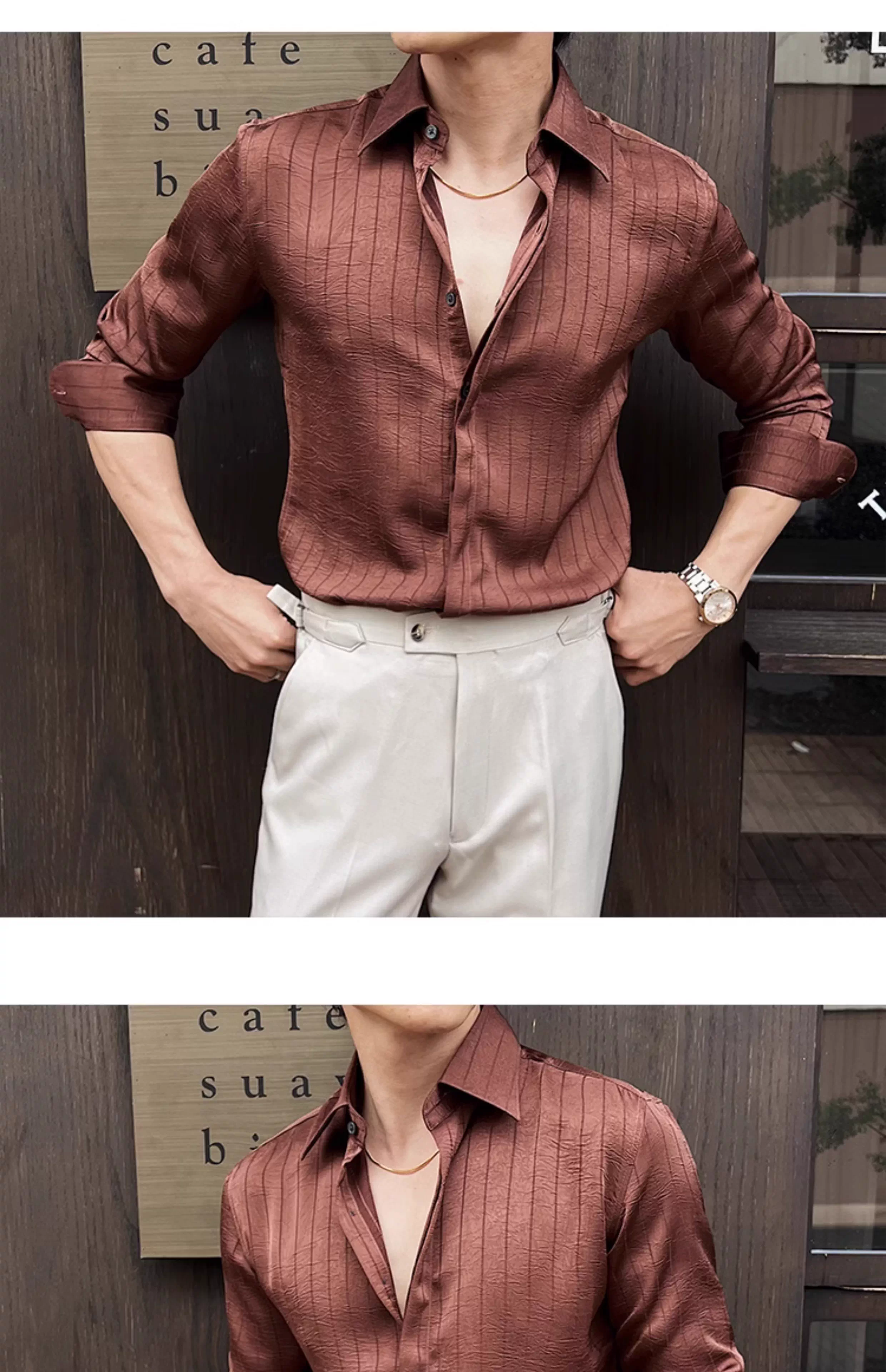 - Áo sơ mi nam kẻ sọc xếp ly dáng dài tay mùa xuân 2025 thiết kế cao cấp mới phong cách thường ngày công sở dáng ôm