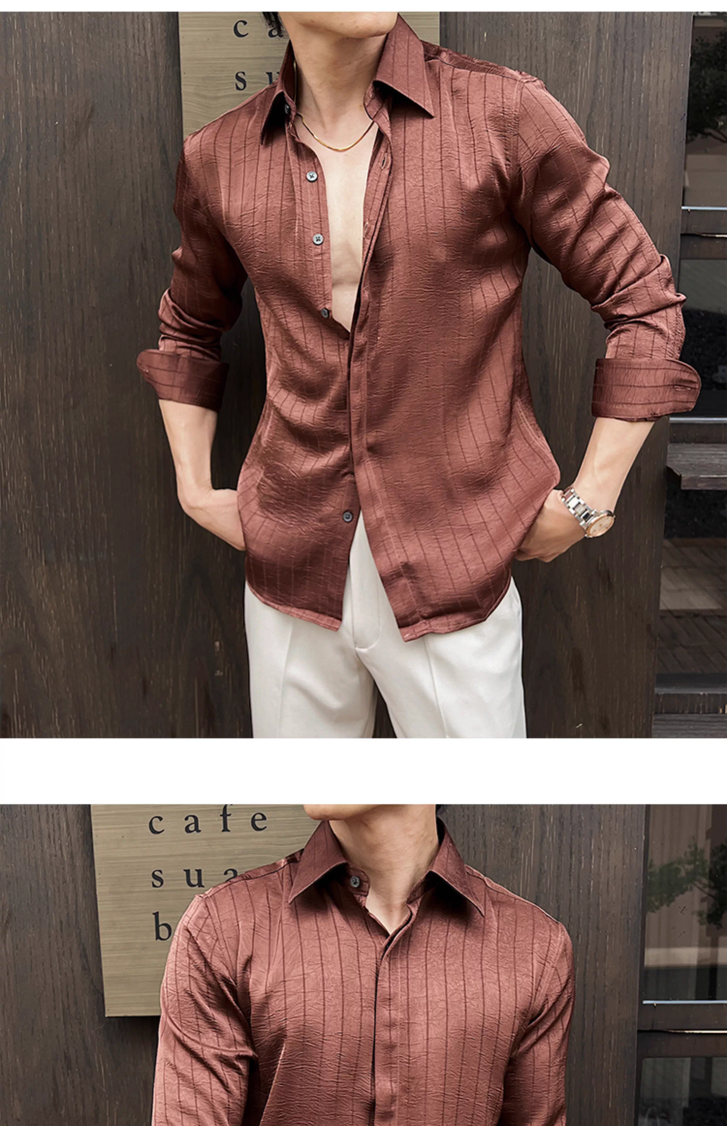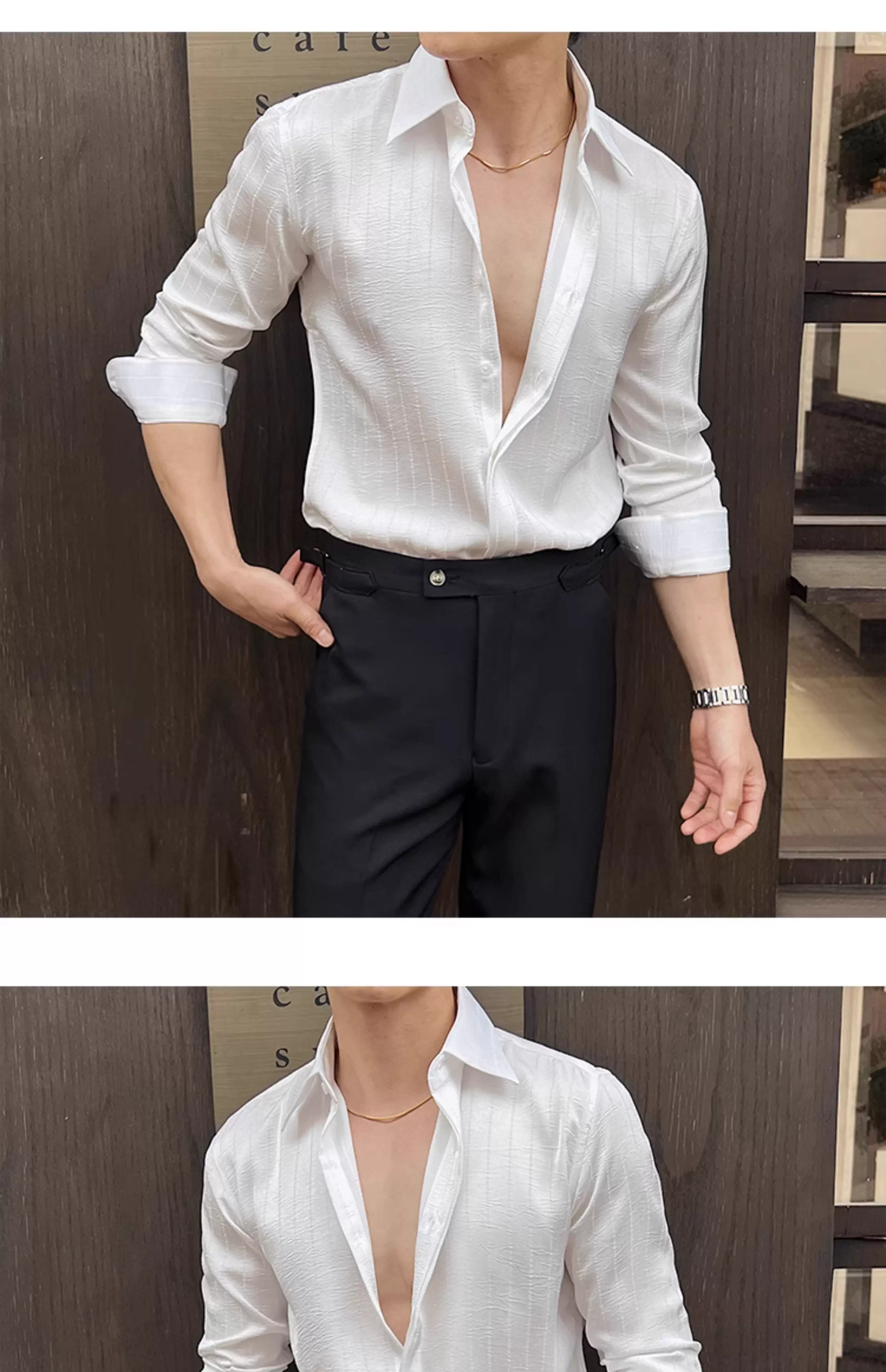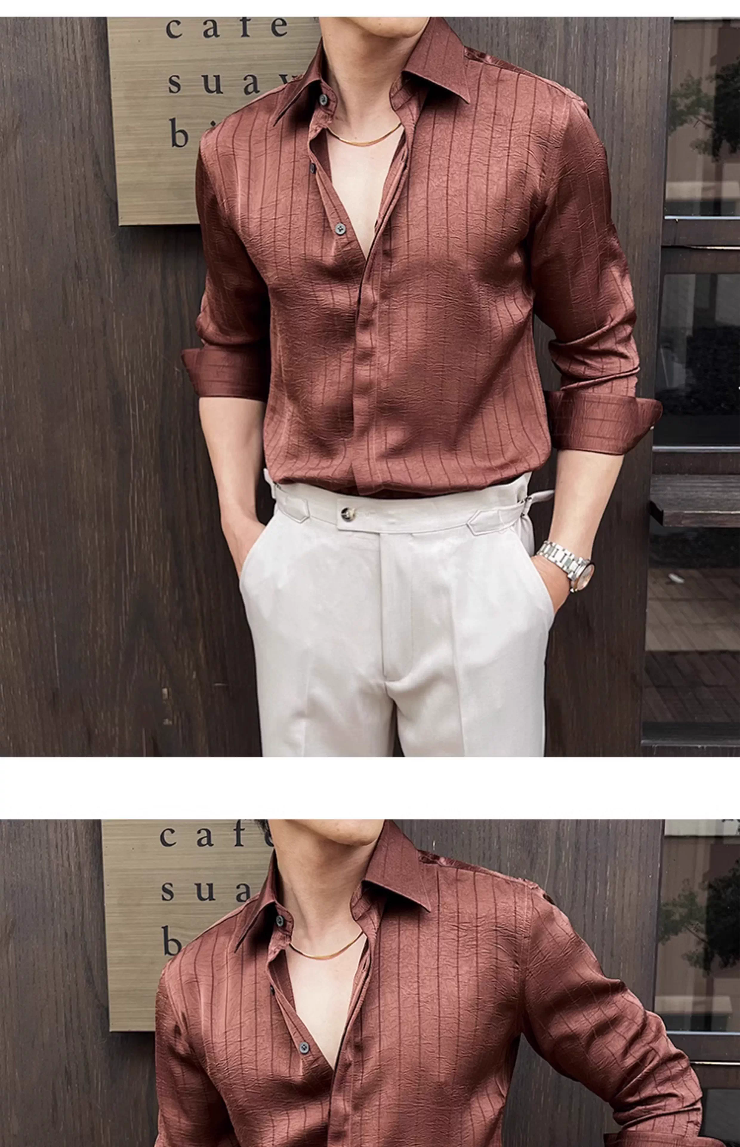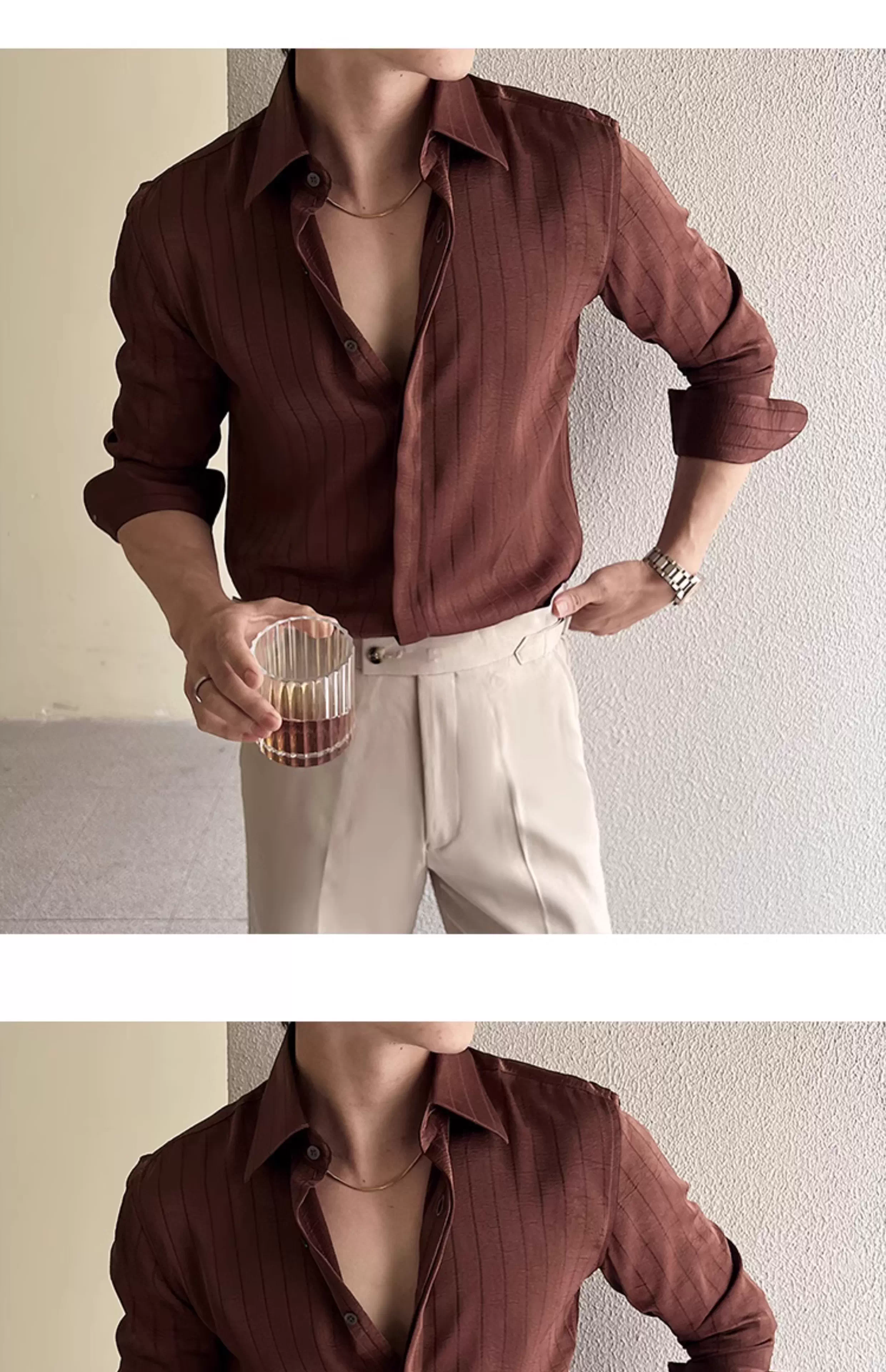 - Áo sơ mi nam kẻ sọc xếp ly dáng dài tay mùa xuân 2025 thiết kế cao cấp mới phong cách thường ngày công sở dáng ôm