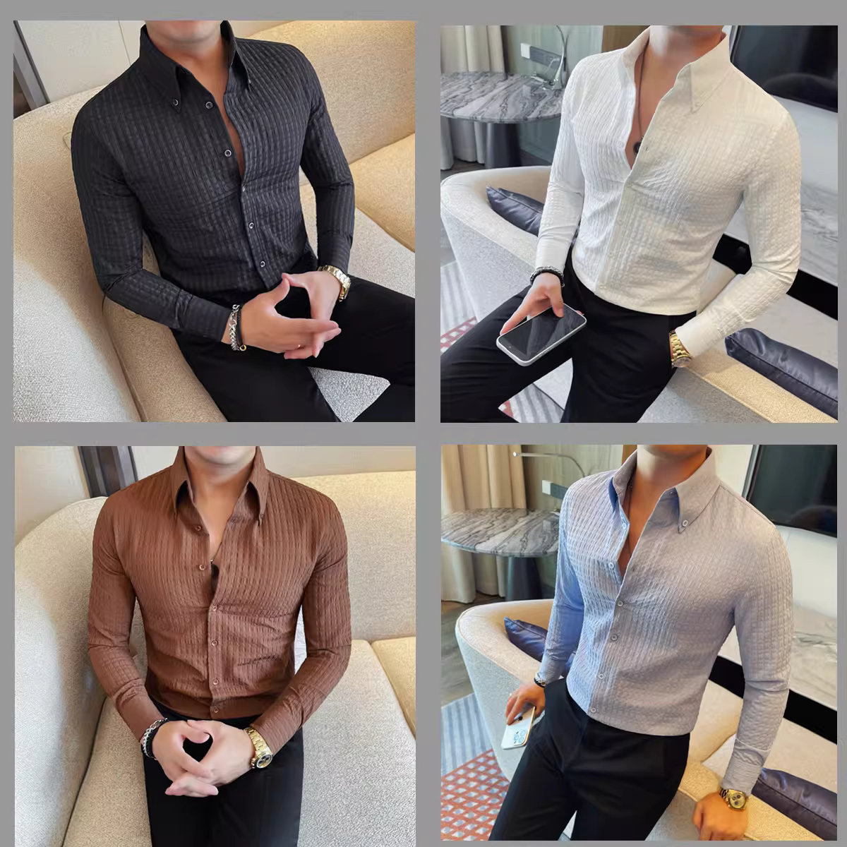 - Áo sơ mi nam kiểu Pháp, cổ trụ lớn, chất liệu waffle, tay dài, kiểu dáng mới thu đông 2025, cao cấp, phong cách casual lịch sự, ôm dáng.