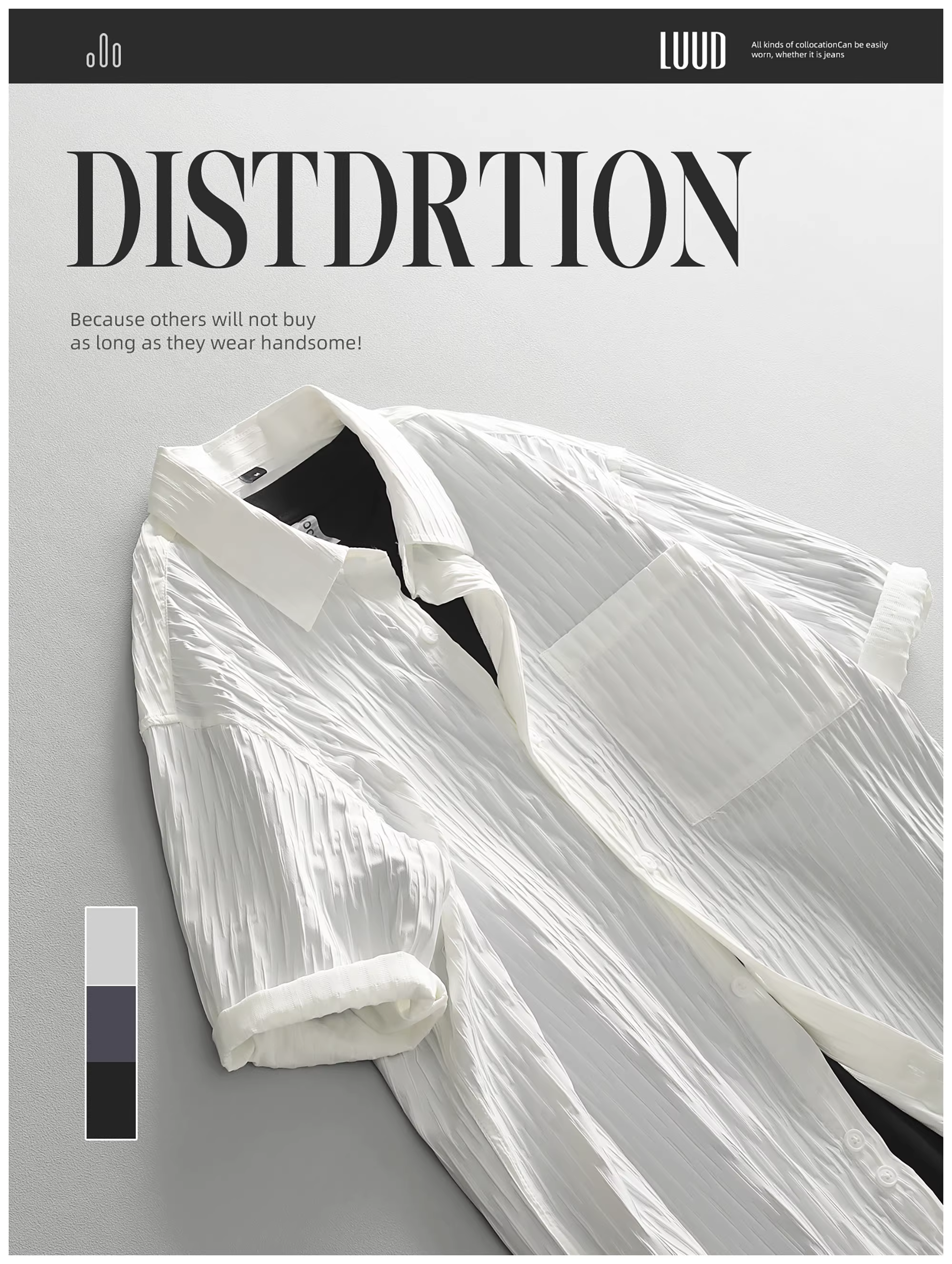 - Áo sơ mi nam tay ngắn có túi xếp ly màu xanh lá cây LUUD cổ bẻ mỏng hơi rộng Áo sơ mi ngắn tay xếp lớp
