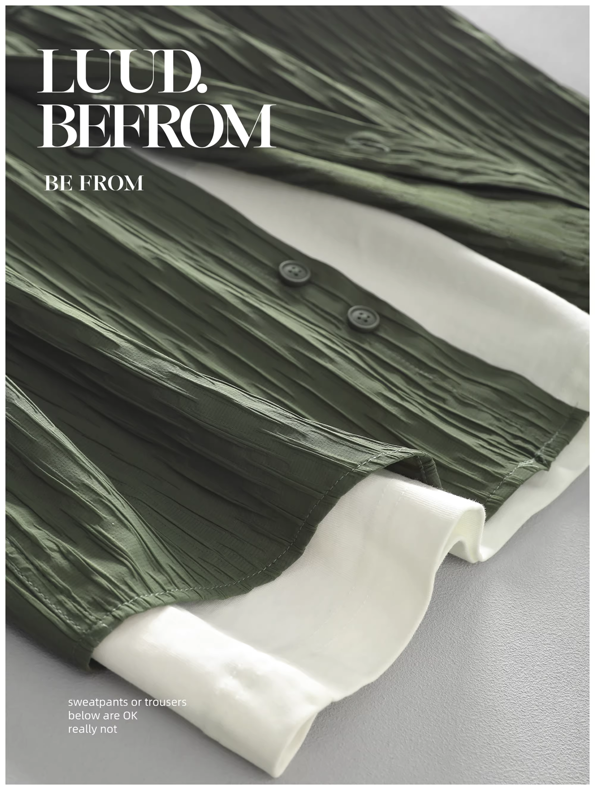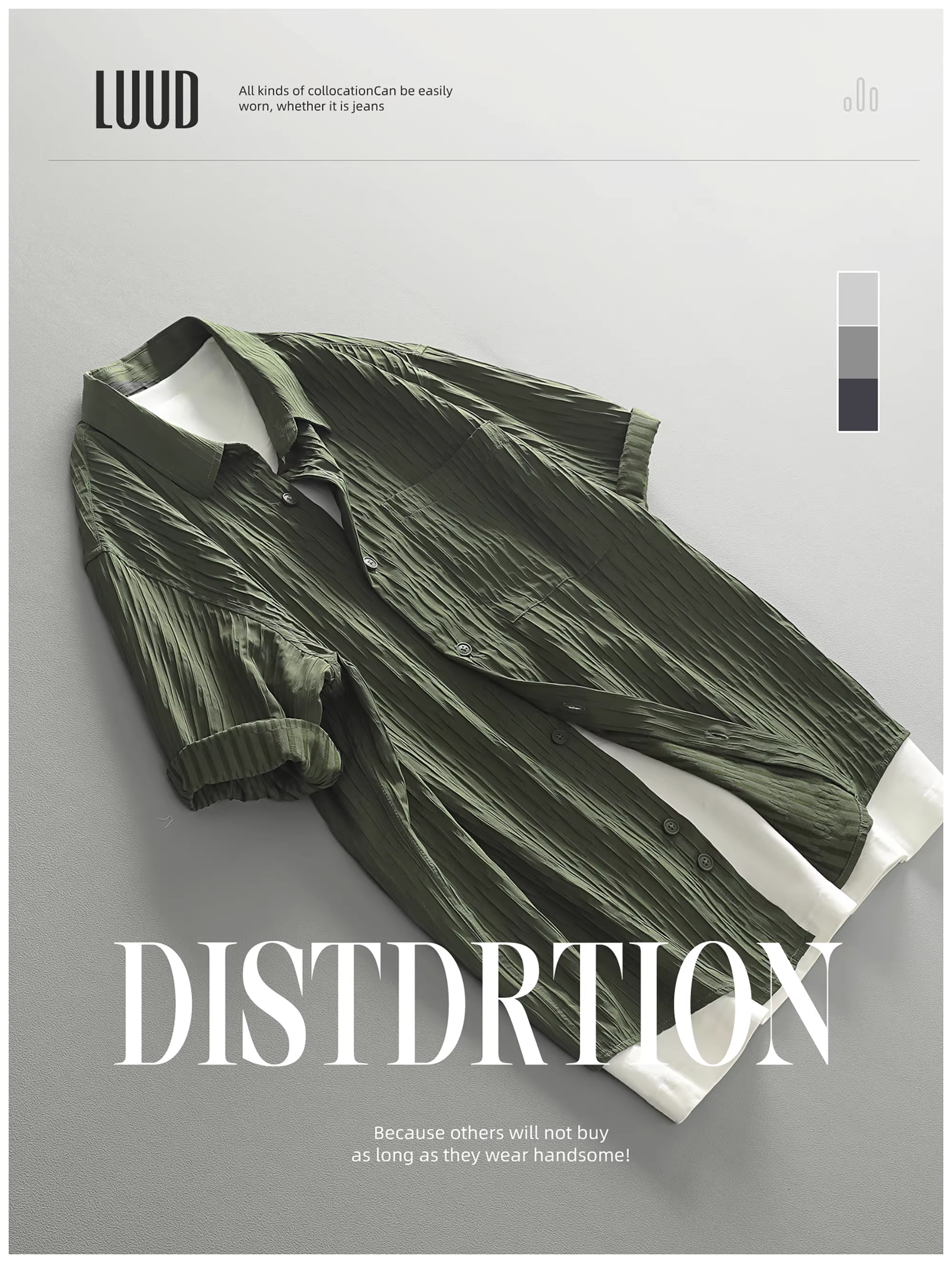 Áo sơ mi nam tay ngắn có túi xếp ly màu xanh lá cây LUUD cổ bẻ mỏng hơi rộng Áo sơ mi ngắn tay xếp lớp