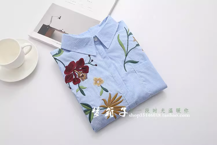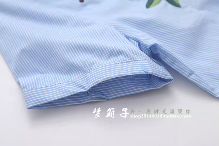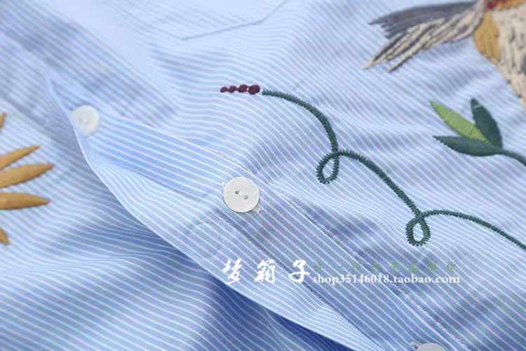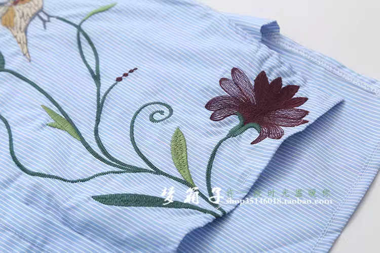 - Áo sơ mi nữ cotton kẻ sọc dọc tay ngắn cổ trụ thêu hoa nặng, mùa hè 2024, Dream Box