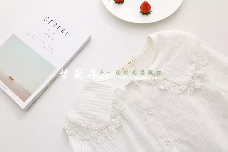 - Áo sơ mi nữ cotton trắng tay ngắn kiểu dáng tươi mát, cổ búp bê viền ren, chất liệu jacquard, Dream Box 2024 mùa hè mới