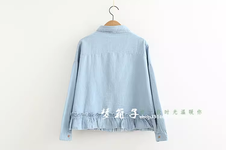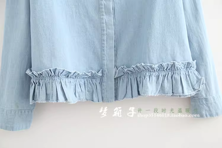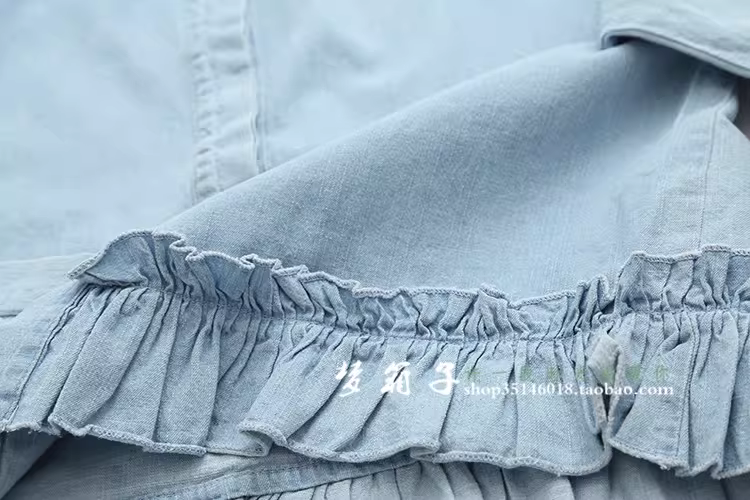 竹节棉牛仔面料,荷叶边拼接下摆,落肩袖宽松休闲款