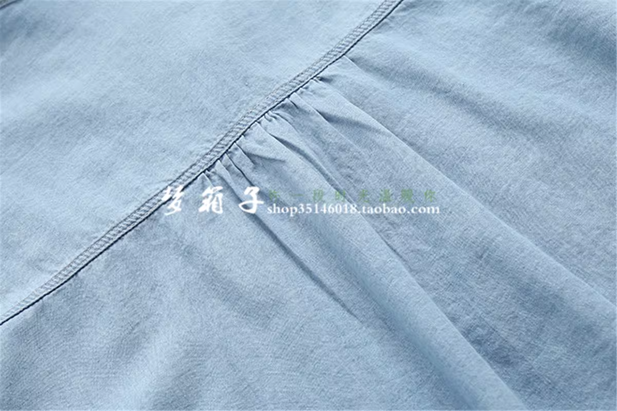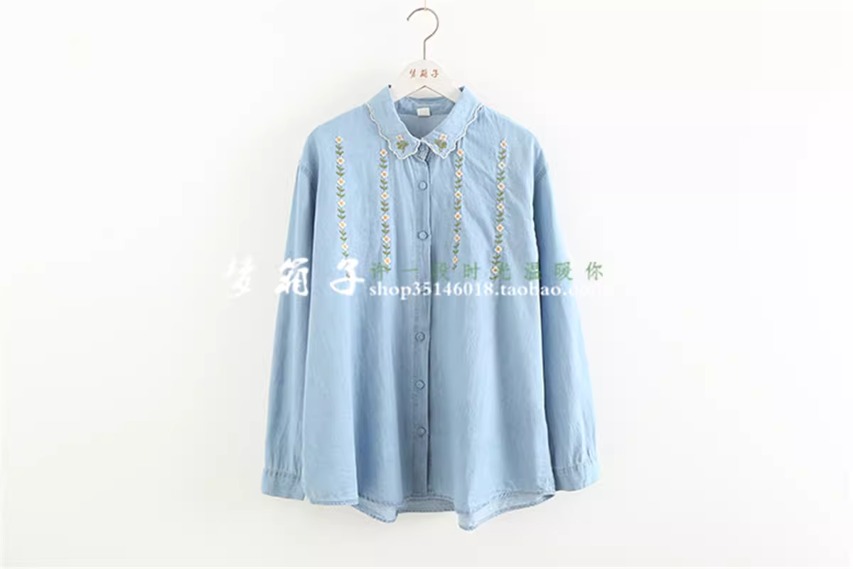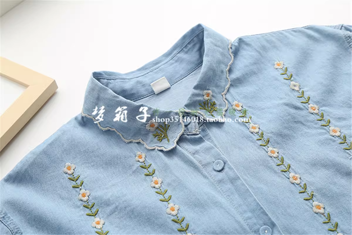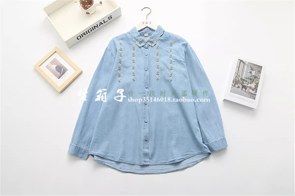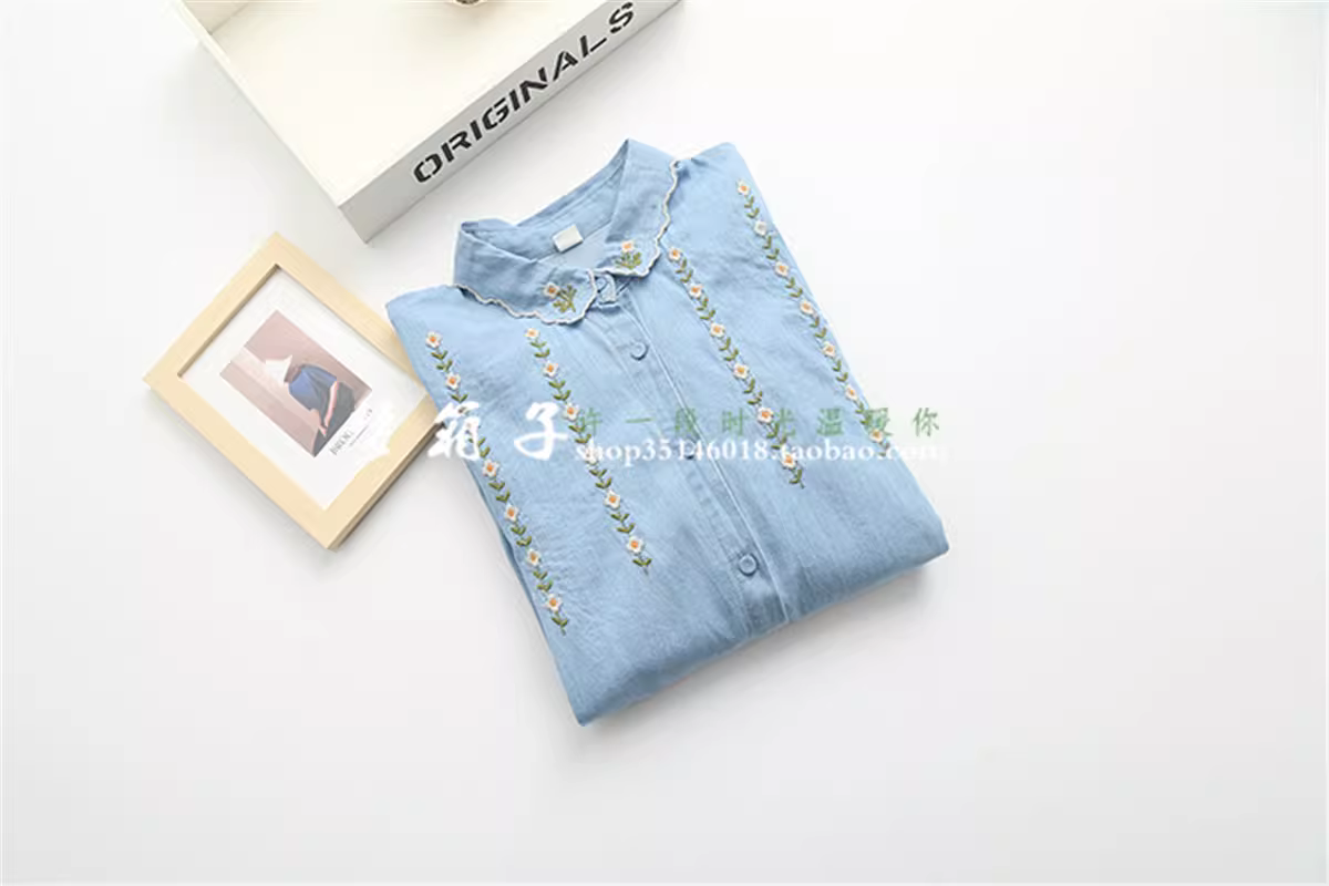- Áo sơ mi nữ thêu hoa nhỏ cổ điển mùa xuân 2023 Dream Box, áo sơ mi denim dáng rộng tay dài cổ trụ thêu