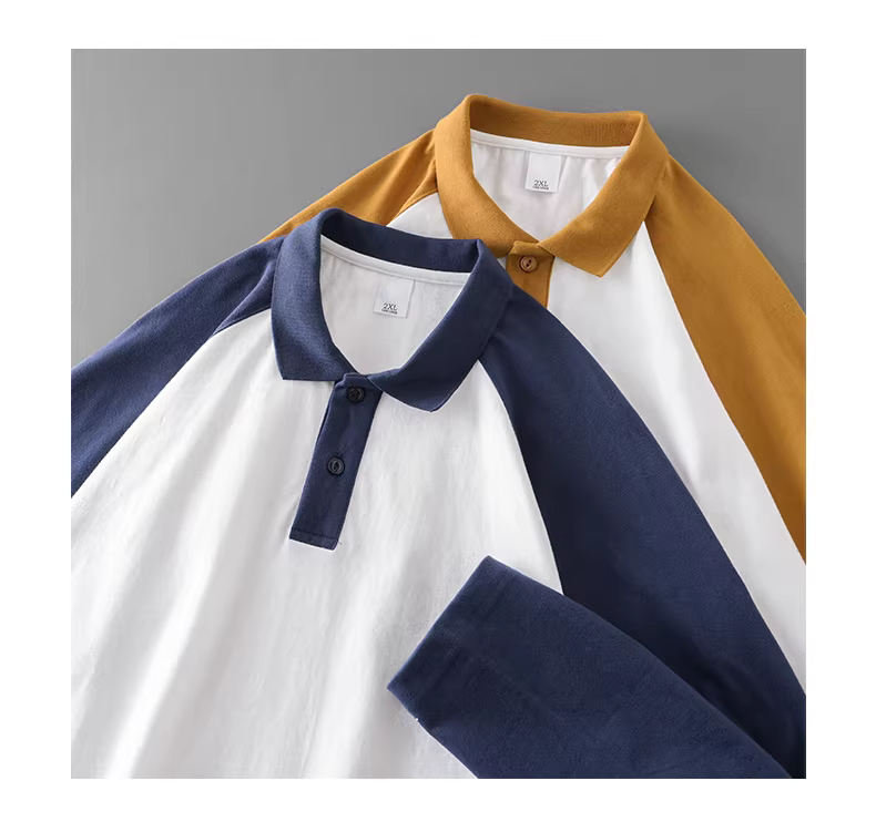 Áo sơ mi POLO chất liệu cotton nguyên chất hạng nặng OMZM320G dành cho nam, áo sơ mi dài tay phối màu raglan mùa thu, áo len dáng rộng cổ bẻ.