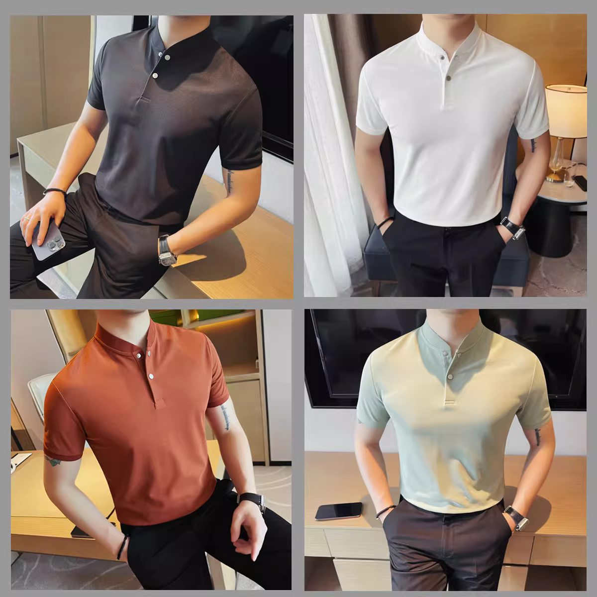 - Áo sơ mi polo cổ đứng ngắn tay kiểu Trung Quốc mới dành cho nam, áo thun cổ trụ dáng ôm thời trang cao cấp phong cách Hàn Quốc mới mùa hè