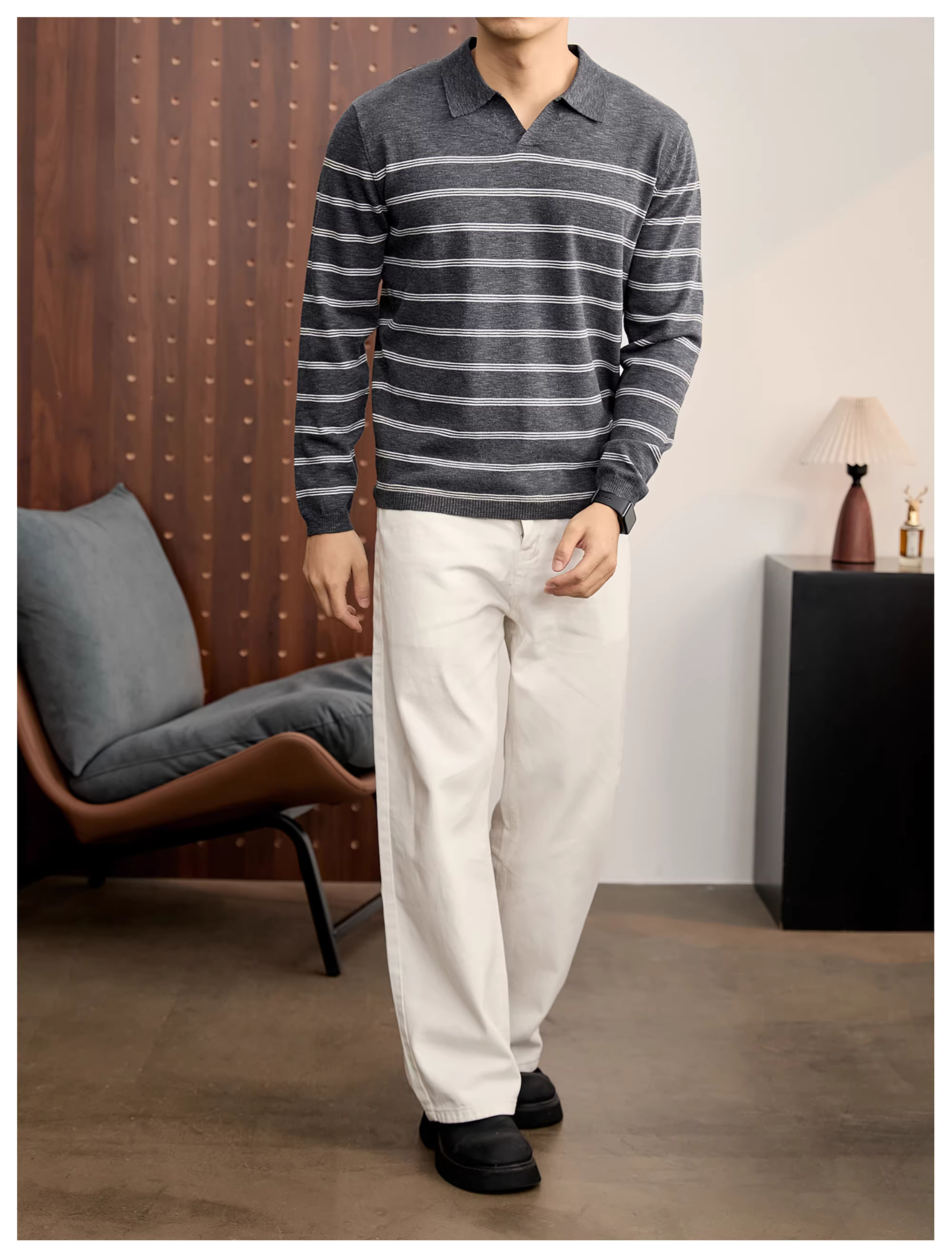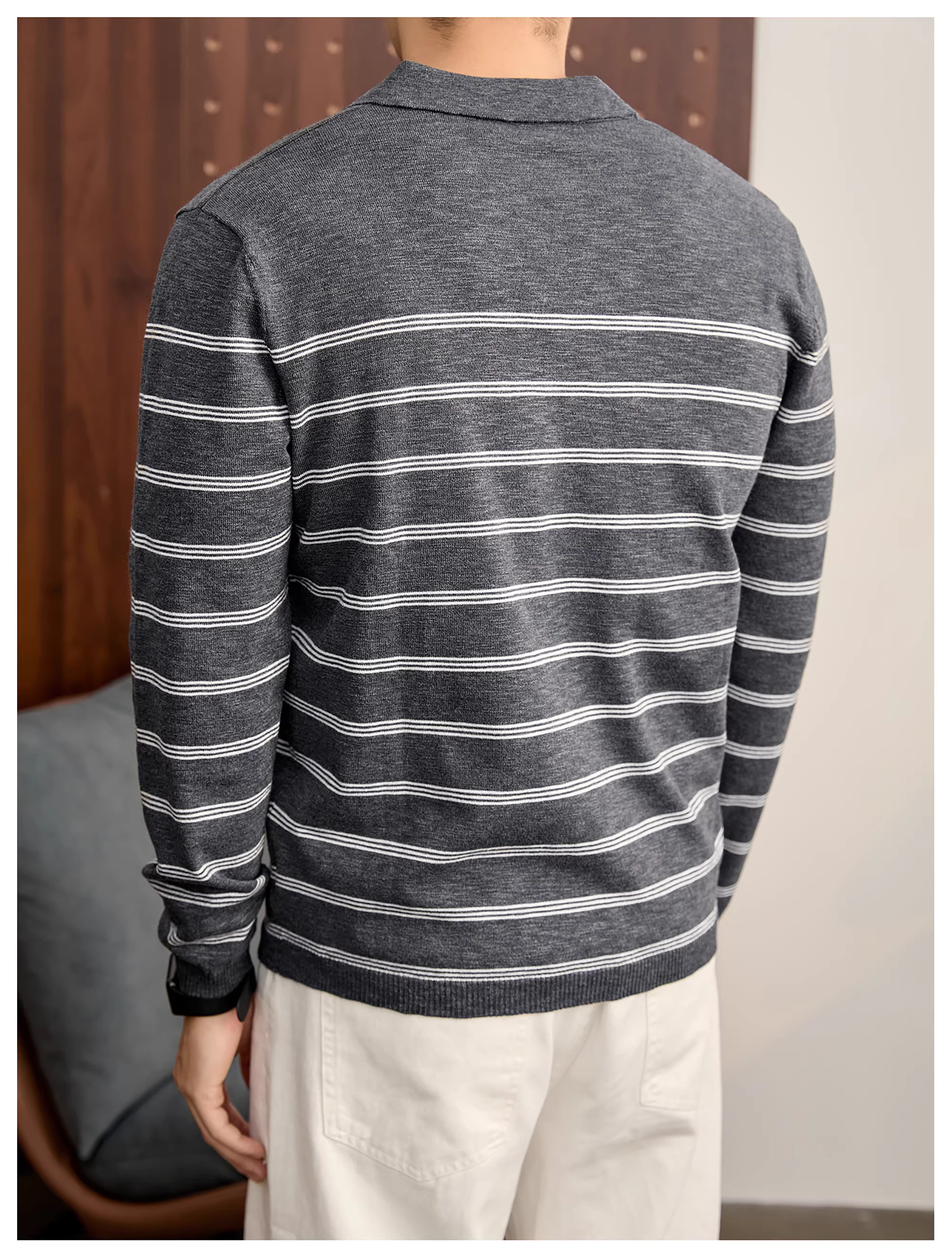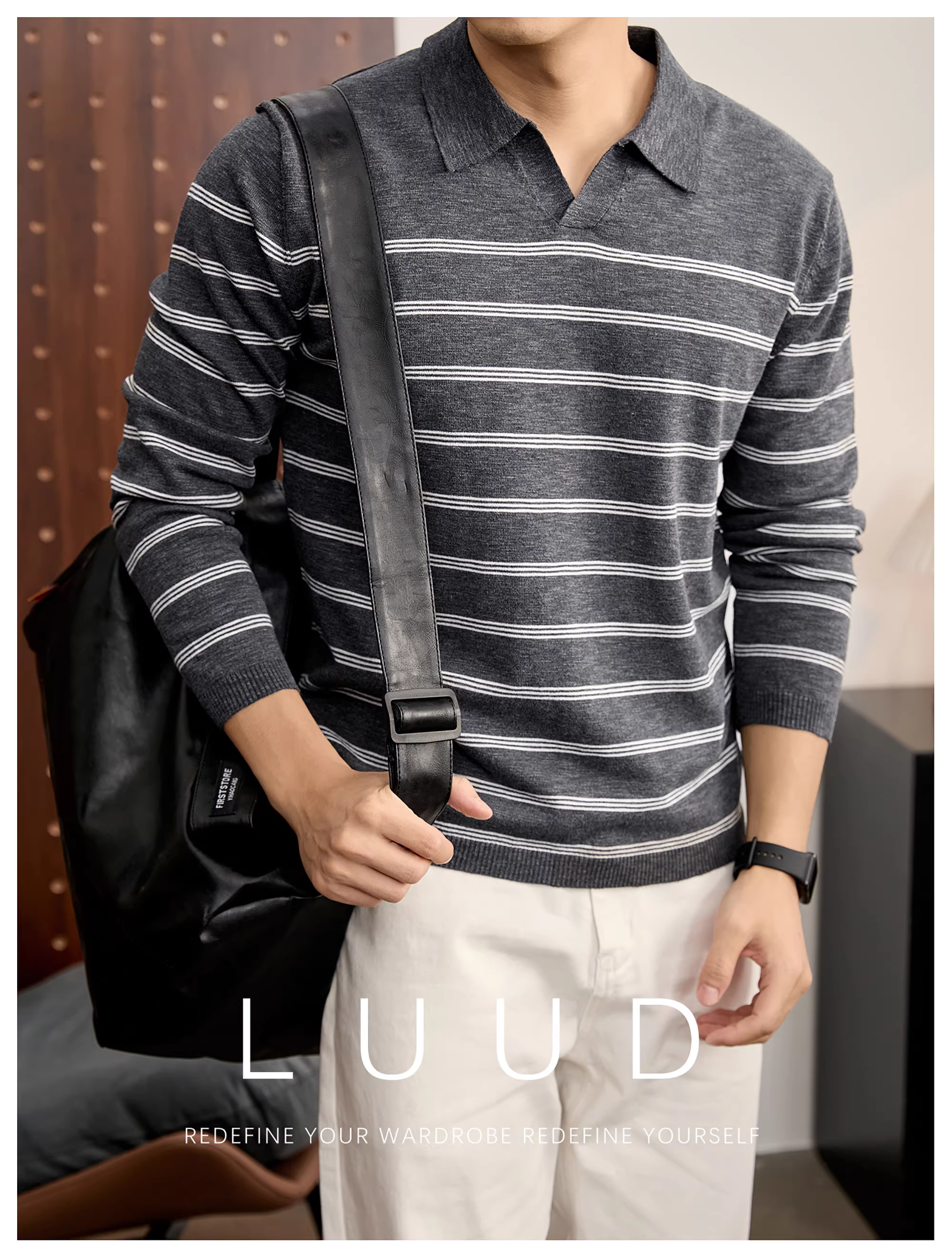Áo sơ mi POLO nam LUUD mùa thu màu xám đậm sọc kẻ dài tay, trang phục công sở sang trọng dễ tiếp cận, áo len dệt kim cổ hải âu thông thường