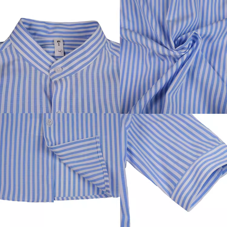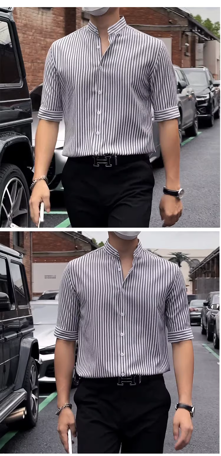 - Áo sơ mi sọc cổ đứng kiểu Trung Quốc mới dành cho nam, tay ngắn, mỏng mùa hè, thời trang, đa năng, ôm dáng, tay áo năm phần.