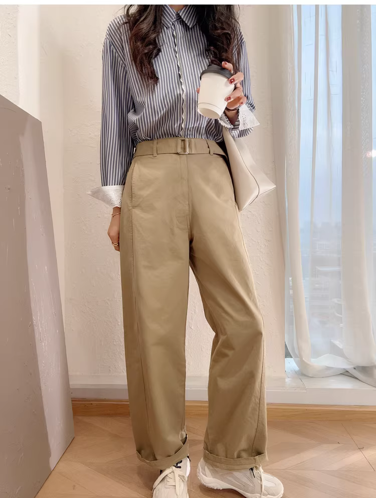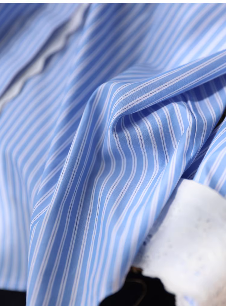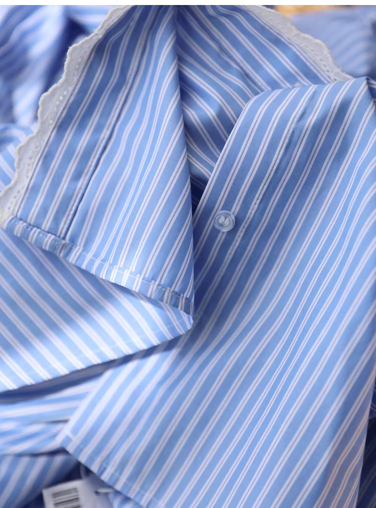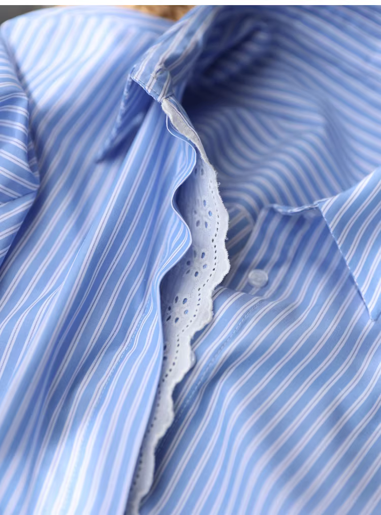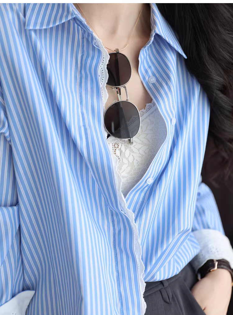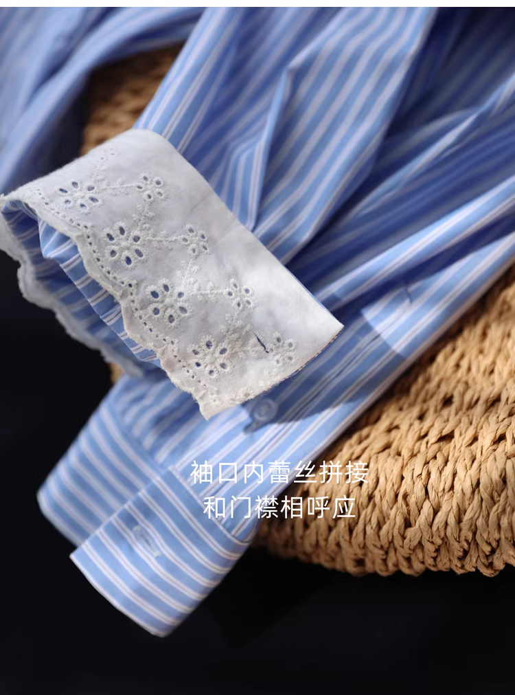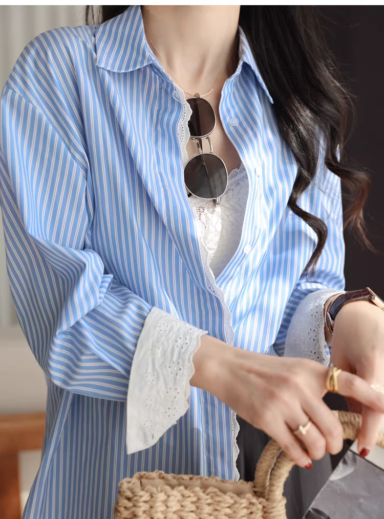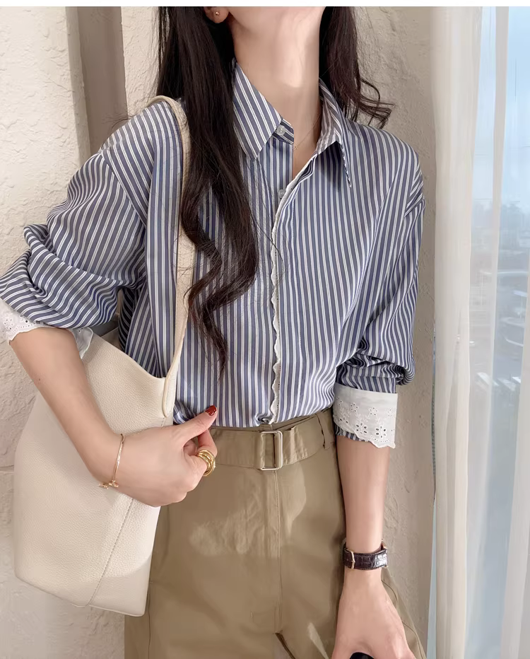 - Áo sơ mi sọc thiết kế phối ren đa năng kiểu Pháp chống nhăn dáng rộng tay dài dành cho nữ mùa xuân