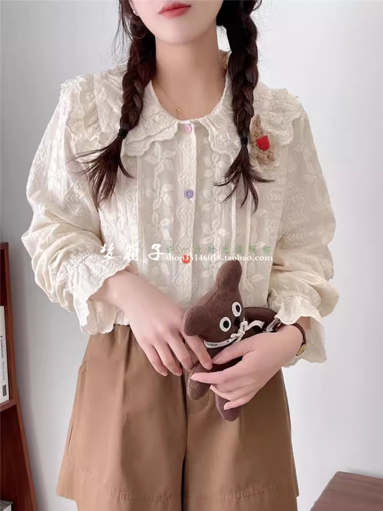 - Áo sơ mi thêu hình thỏ hoạt hình mùa xuân 2025 Dream Box, cổ áo búp bê ren, tay bèo, nút nhiều màu sắc