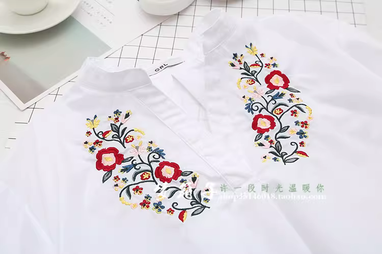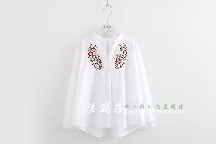 - Áo sơ mi thêu hoa phong cách dân tộc Xuân 2024 Dream Box, cổ đứng, kiểu dáng rộng rãi, chất liệu cotton trắng đa năng