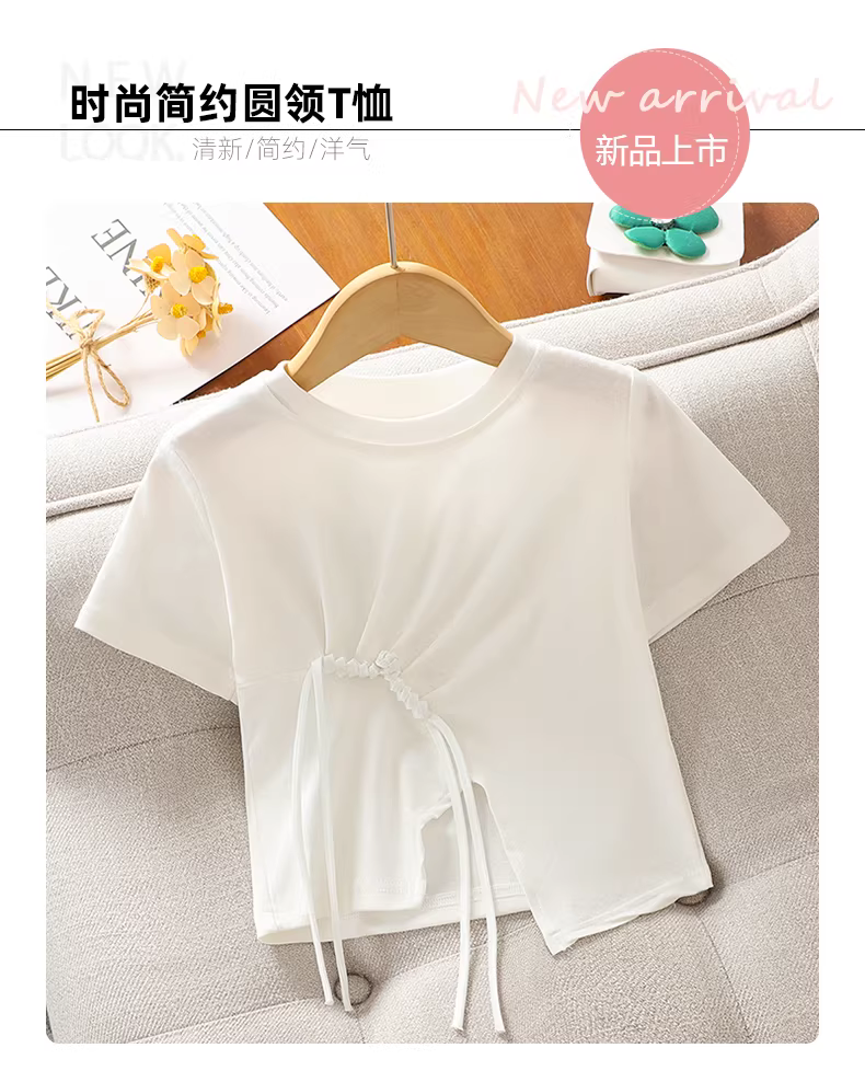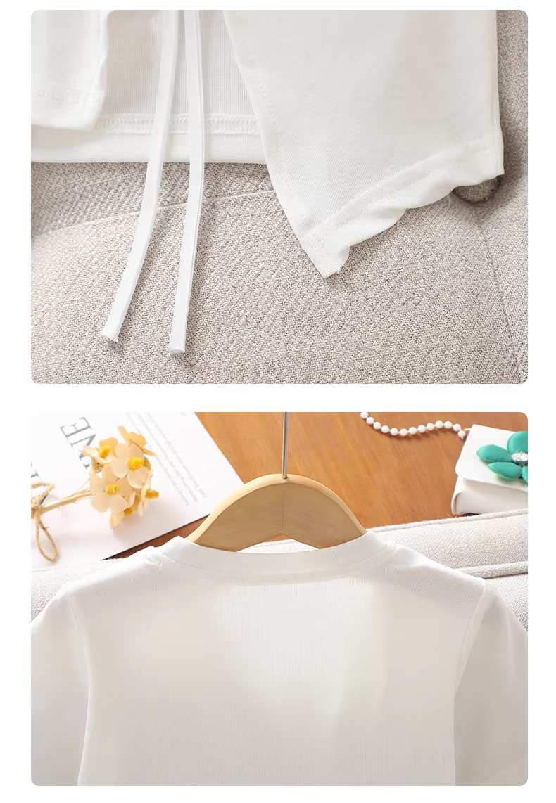 - Áo thun bé gái mùa hè 2025 kiểu mới, áo thun ngắn tay xẻ tà chất cotton nguyên chất màu trắng dành cho bé gái lớn