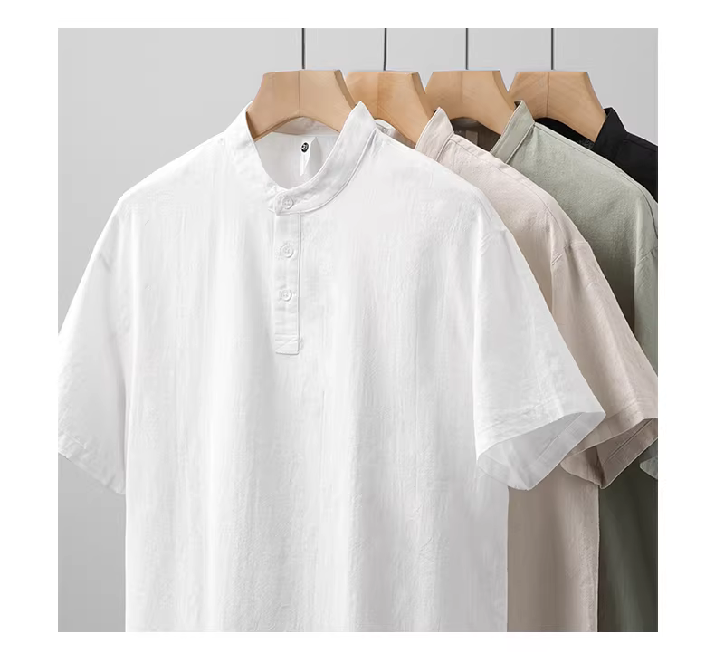 Áo thun cổ Henry bằng cotton nguyên chất dành cho nam, tay ngắn, kiểu dáng mỏng mùa hè, dáng rộng, áo sơ mi cổ đứng kiểu Barn, áo thun vai thường.