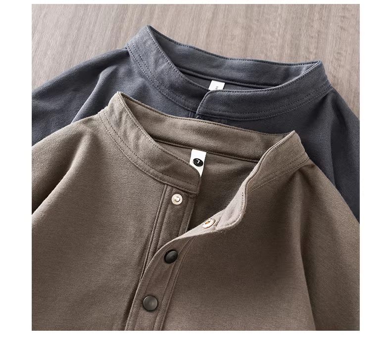 - Áo thun cổ Henry chất liệu cotton nguyên chất hạng nặng 340G dành cho nam, áo sơ mi dài tay phong cách Mỹ cổ điển mùa xuân thu, áo thun cổ Henry màu trơn