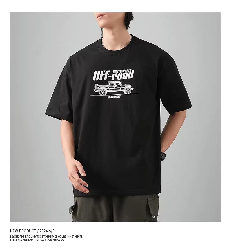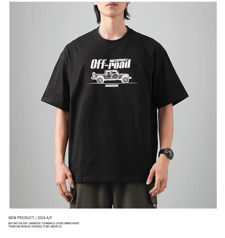 - Áo thun cotton nguyên chất hạng nặng 320G dành cho nam, tay ngắn, in hình xe hơi cổ điển mùa hè của Mỹ, áo thun nửa tay dáng rộng hợp thời trang dành cho nam