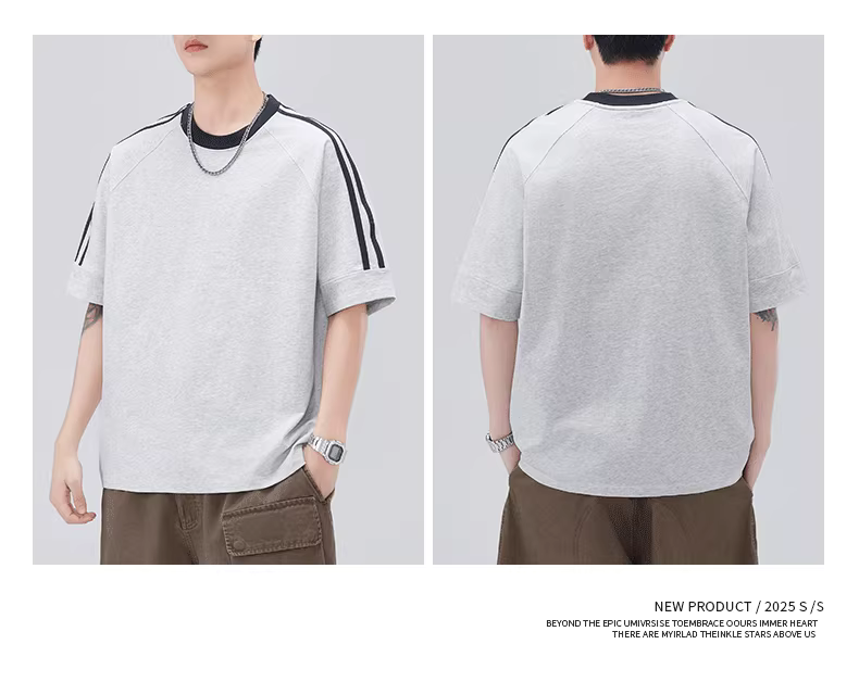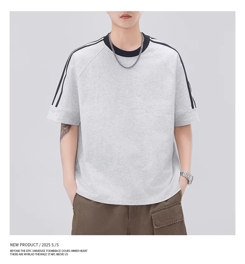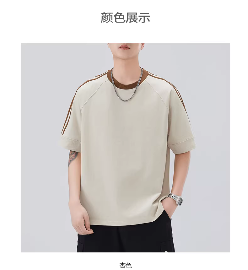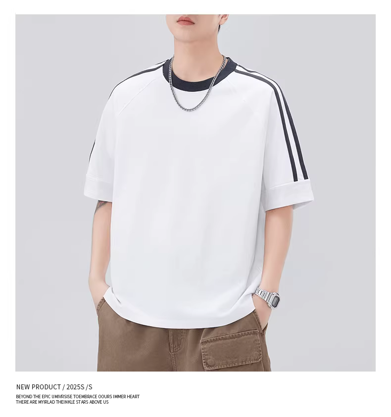 - Áo thun cotton nguyên chất sọc ngang nam, tay ngắn, dáng rộng, phong cách giản dị Mỹ, tay raglan phối màu, mặc mùa hè.