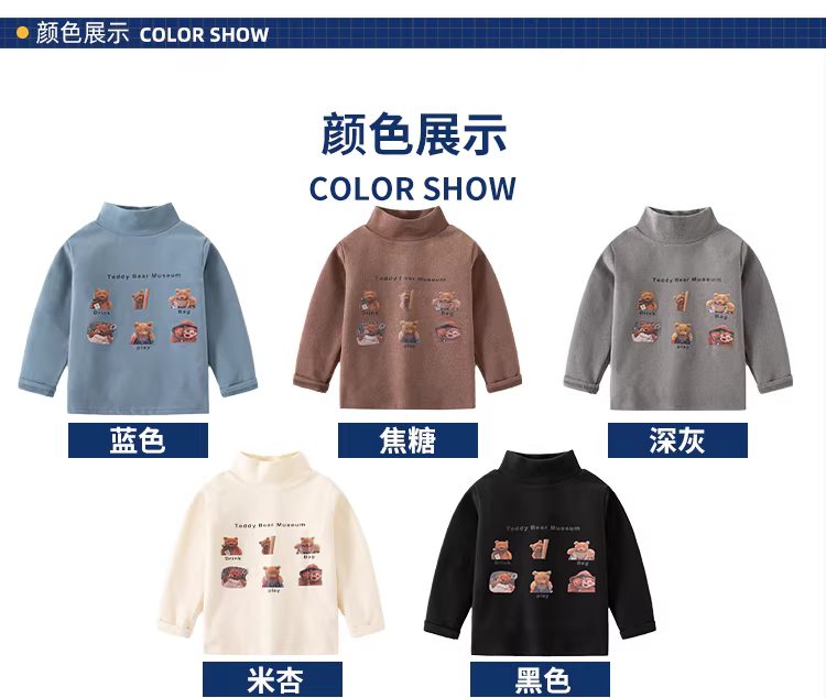 Áo thun dài tay cổ cao cho trẻ em, phong cách Hàn Quốc và Nhật Bản, thiết kế hình gấu hoạt hình mùa xuân đông, áo lót bé trai, áo lót giữ nhiệt cho bé 2
