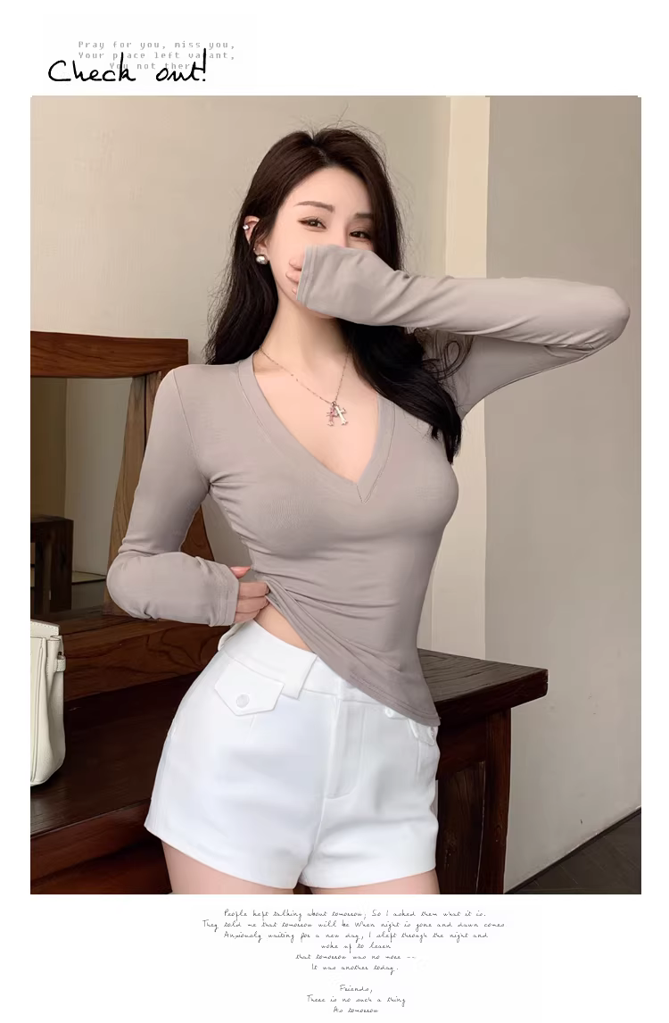 Áo thun dài tay cổ chữ V dành cho nữ, thích hợp cho mùa xuân, mùa thu và mùa đông, có thể mặc như lớp lót bên trong, kiểu dáng ngắn, rất hấp dẫn và trẻ trung, nhẹ nhàng và trông trưởng thành.