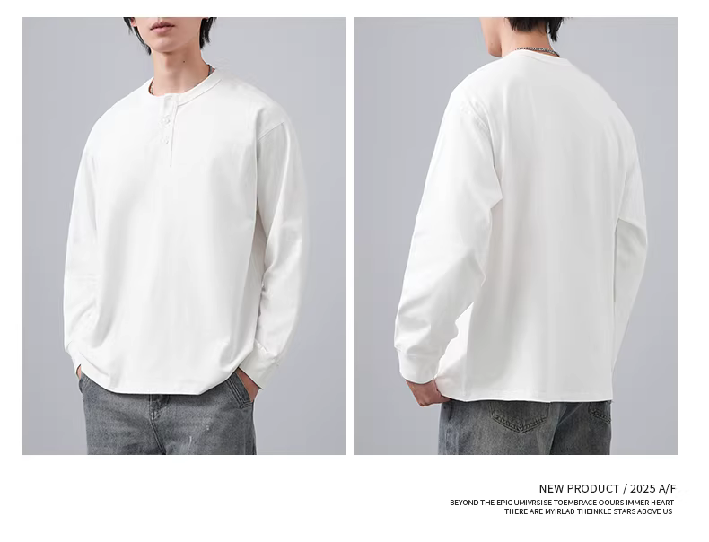 • Áo thun dài tay cổ Henry hạng nặng dành cho nam, áo nỉ thường ngày kiểu Mỹ mùa thu, áo sơ mi màu trắng trơn rộng rãi.