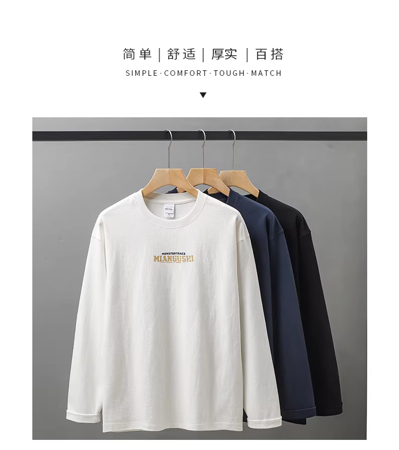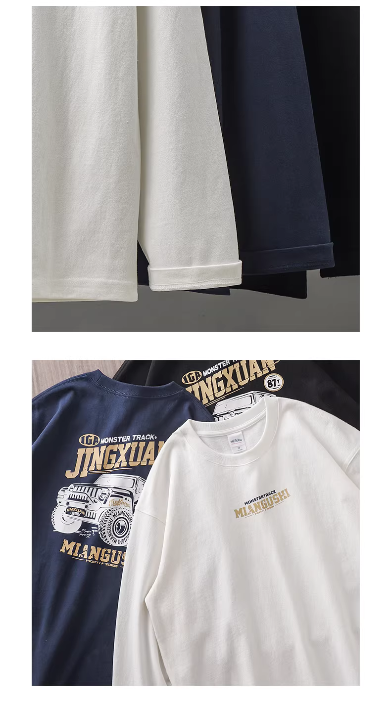 Áo thun dài tay hạng nặng 320G phong cách Nhật Bản dành cho nam, áo len cotton nguyên chất phong cách núi mùa thu với áo sơ mi in hình xe địa hình của Mỹ