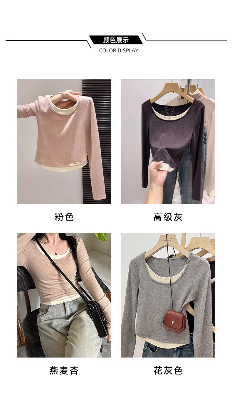 - Áo thun dài tay màu hồng La Chapelle dành cho nữ, kiểu mới xuân thu 2025, áo lót giả hai mảnh phối màu.