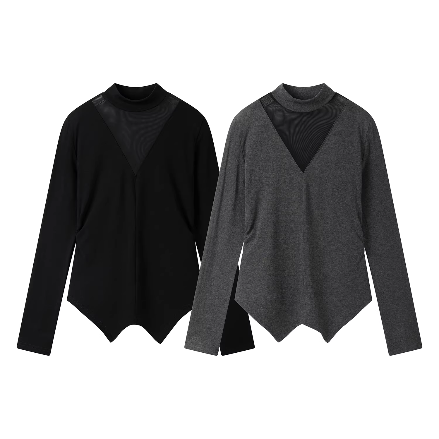 Áo thun dài tay phối lưới cổ cao nửa cổ NSROU dành cho nữ, thiết kế thu đông, dáng ôm, áo lót.