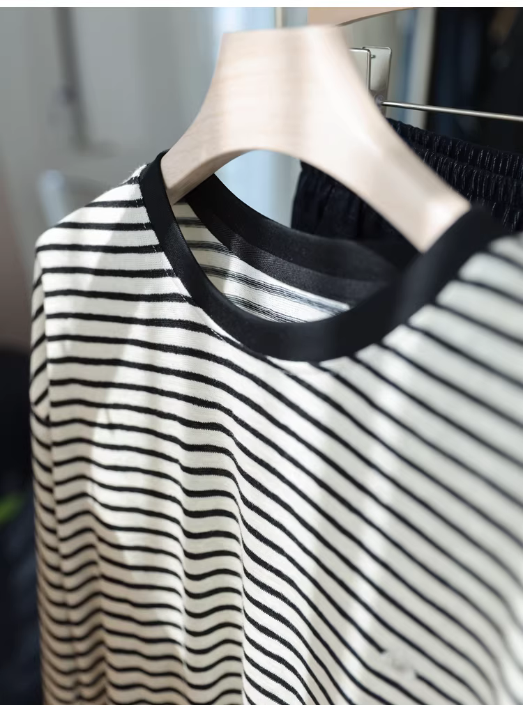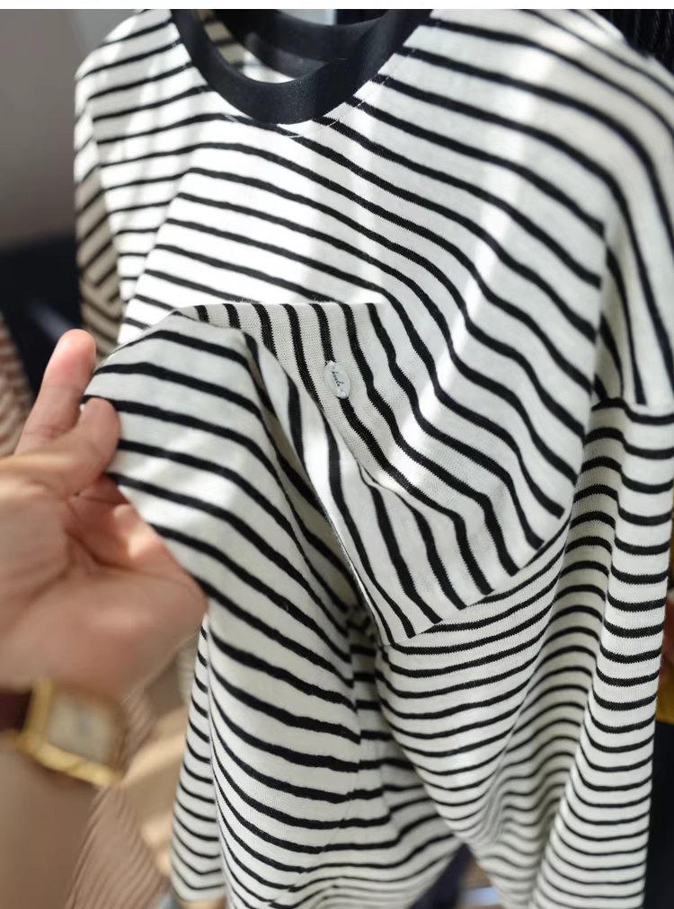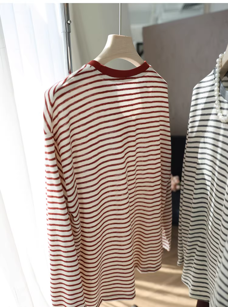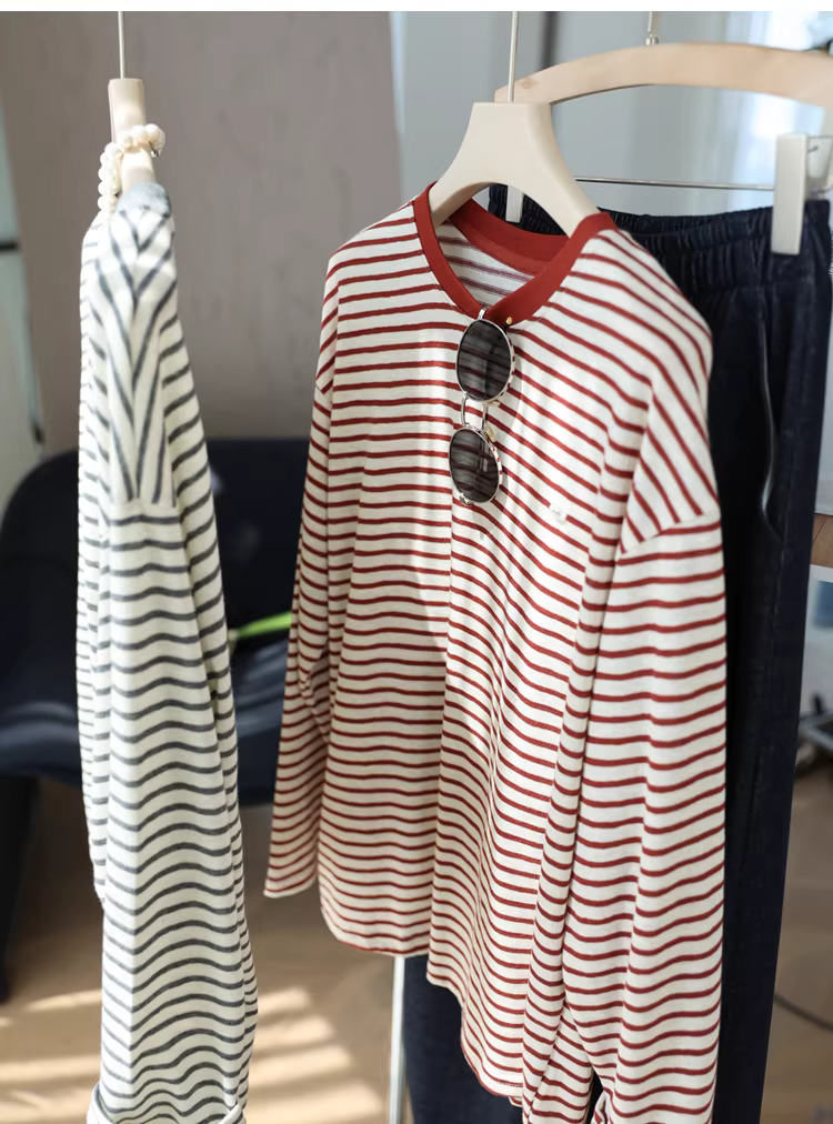 - Áo thun dài tay sọc dáng rộng, cổ tròn, kiểu dáng thoải mái và năng động theo phong cách Hàn Quốc, mới cho mùa thu dành cho nữ.