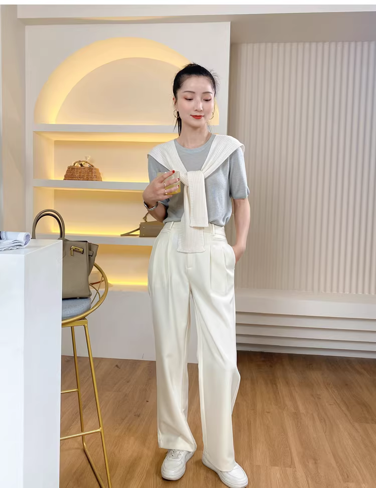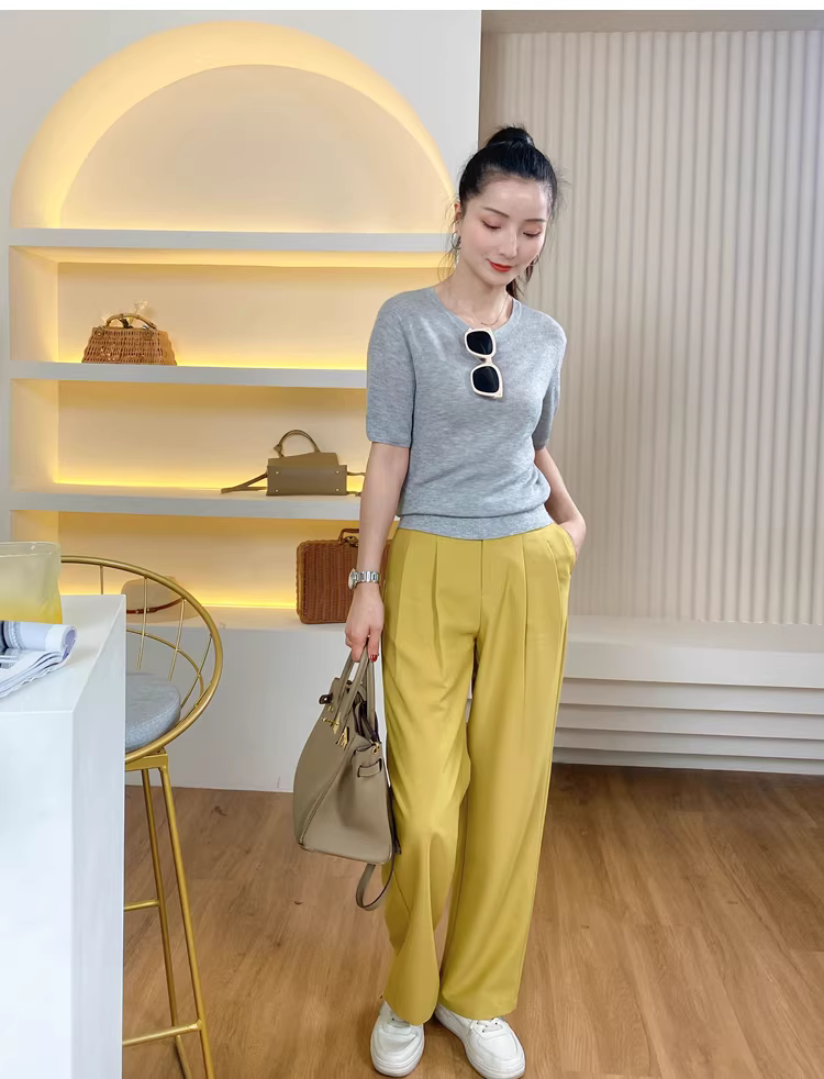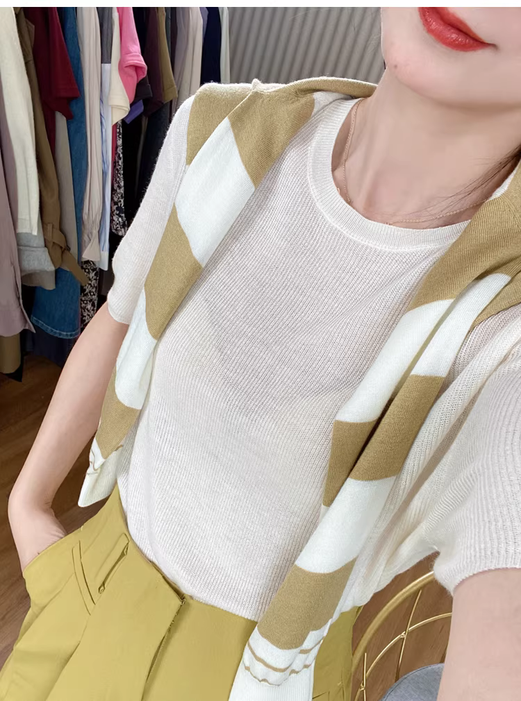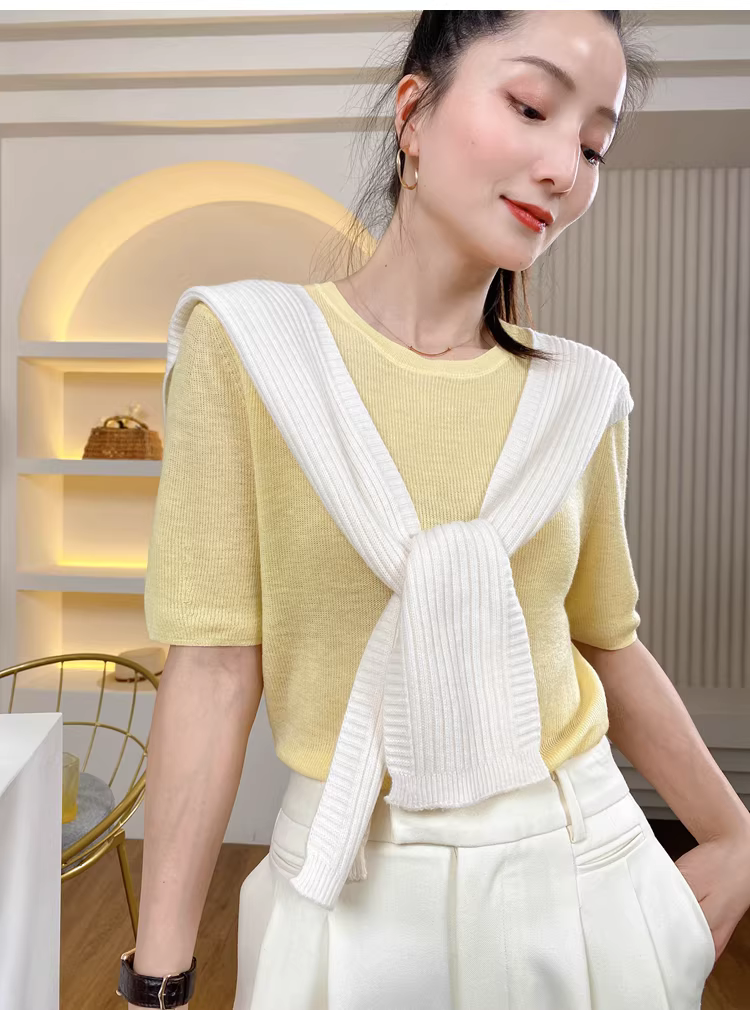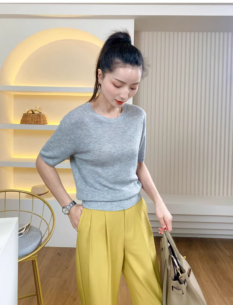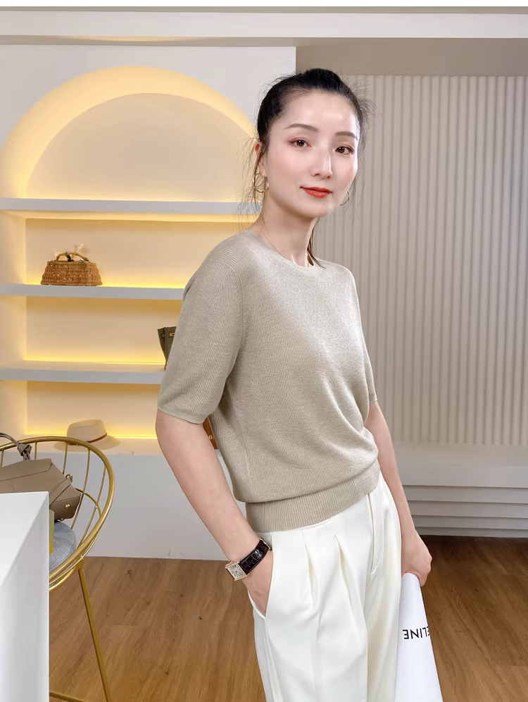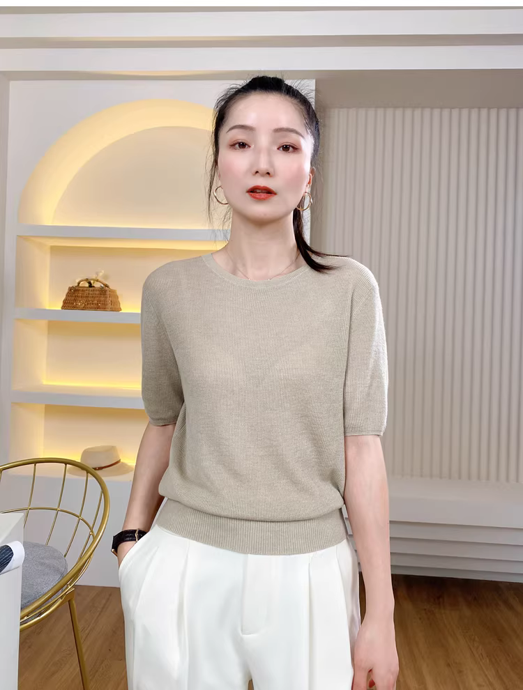 - Áo thun dệt kim nửa tay cổ tròn màu kem len mercerized thân thiện với da dành cho nữ mùa xuân