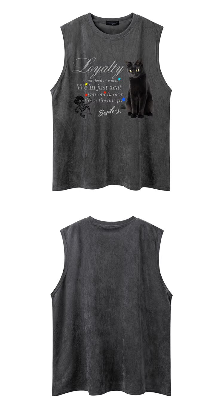- Áo thun không tay in hình mèo cổ điển màu đen siêu dễ thương từ sao Hỏa dành cho nam và nữ, tay ngắn bằng da lộn rộng rãi