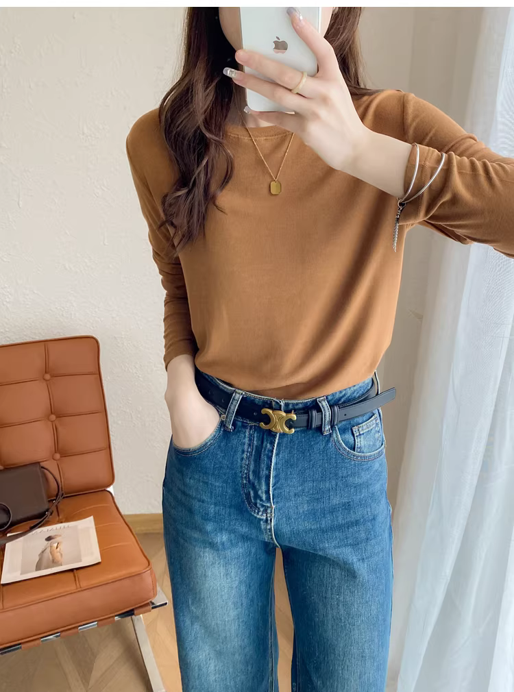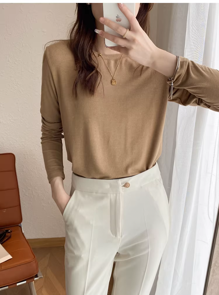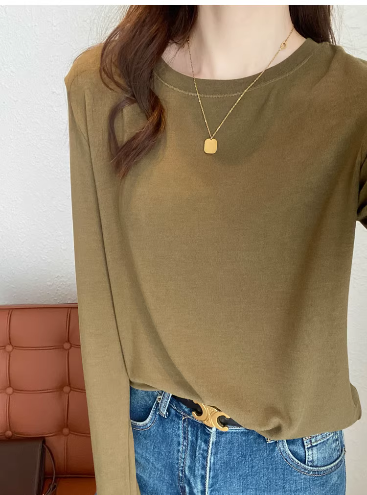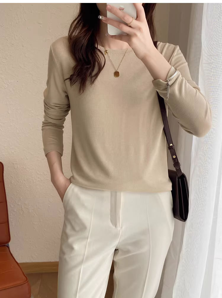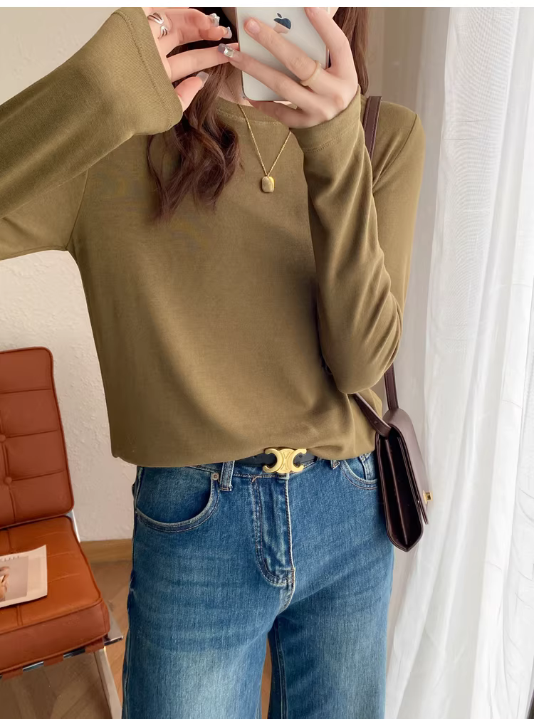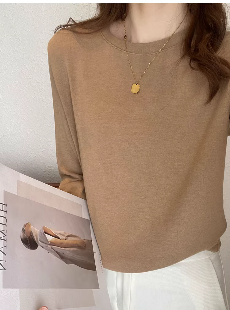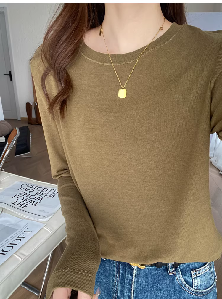 - Áo thun len trơn cổ tròn + cổ lọ nửa cao, dáng rộng, đa năng, tay dài dành cho nữ, mùa thu đông mới