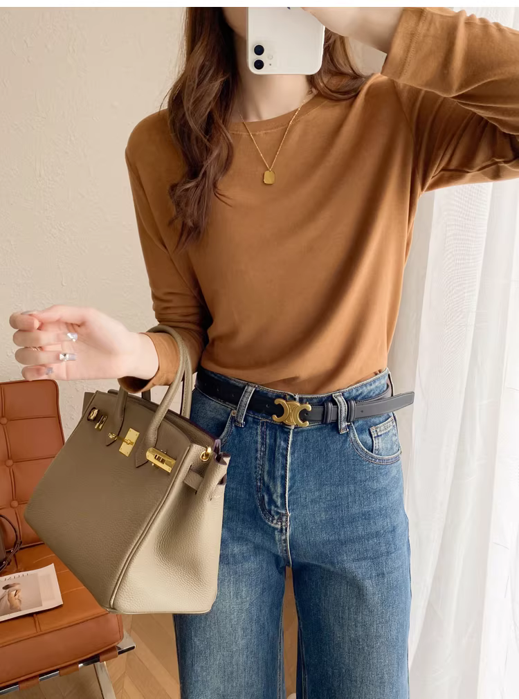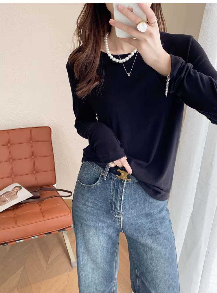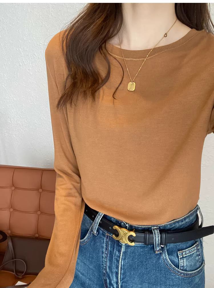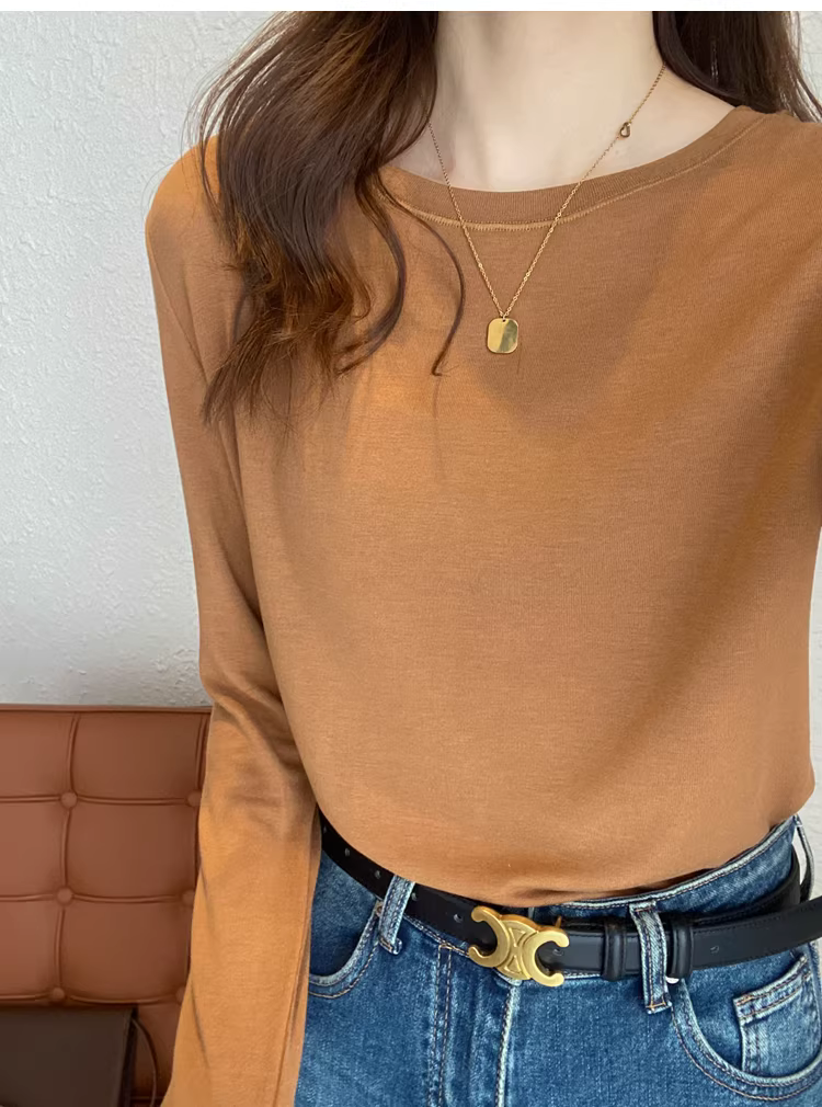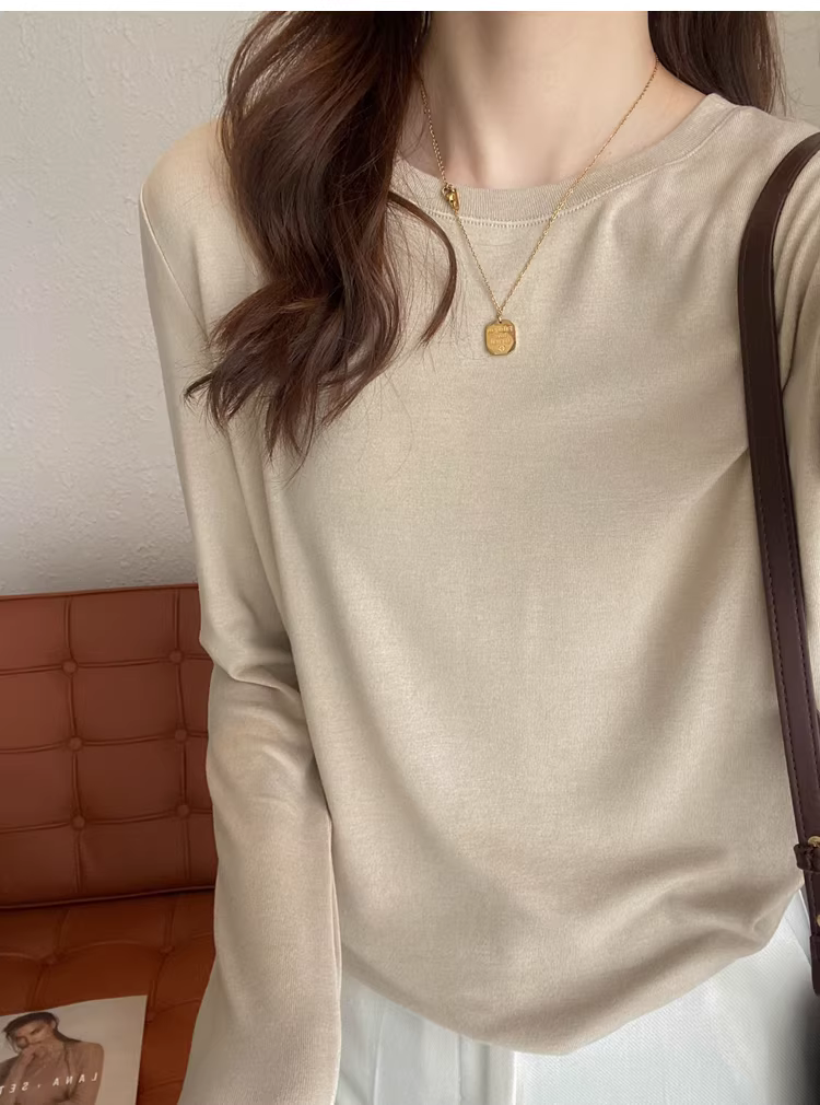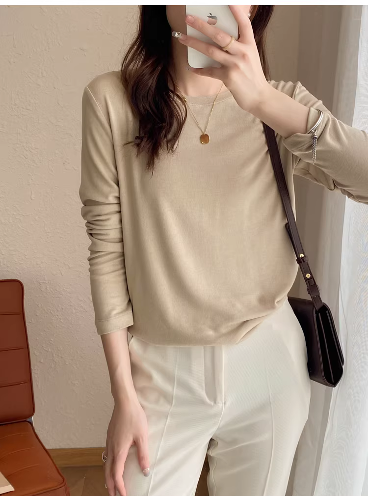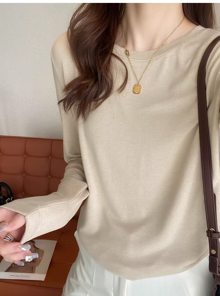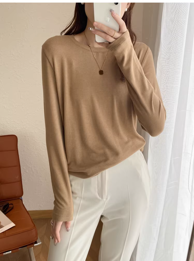 - Áo thun len trơn cổ tròn + cổ lọ nửa cao, dáng rộng, đa năng, tay dài dành cho nữ, mùa thu đông mới