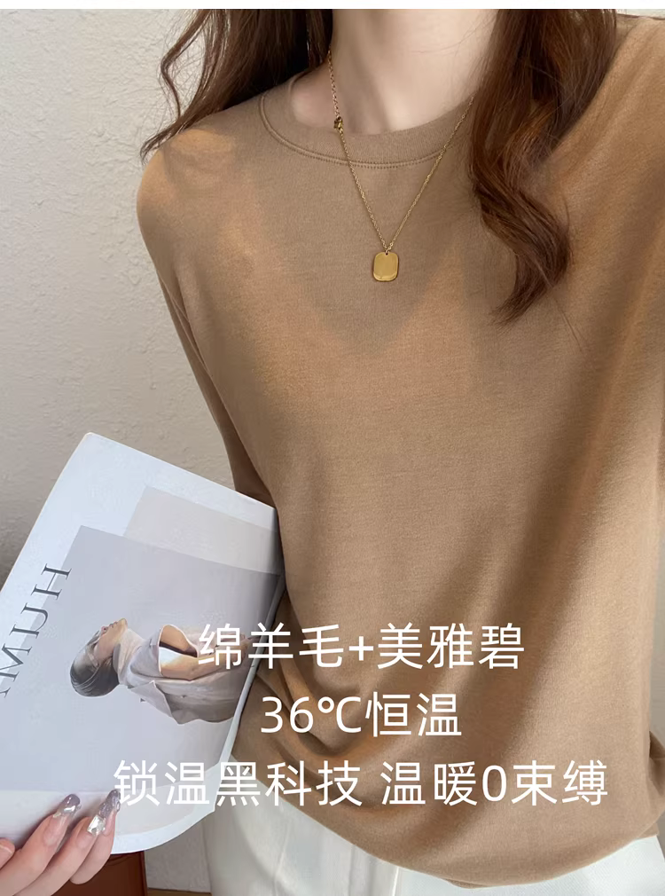 Áo thun len trơn cổ tròn + cổ lọ nửa cao, dáng rộng, đa năng, tay dài dành cho nữ, mùa thu đông mới