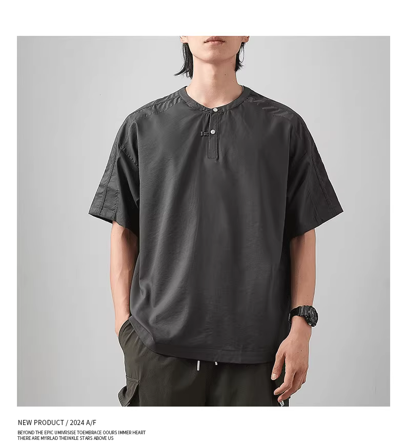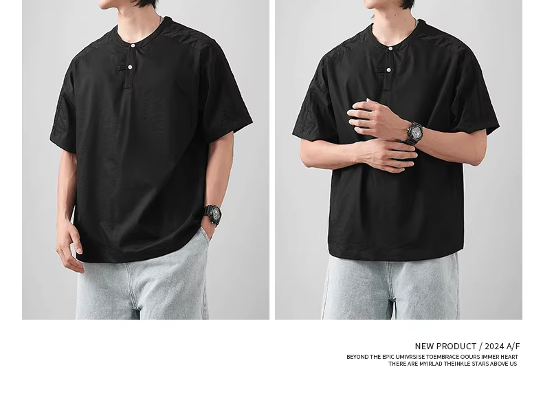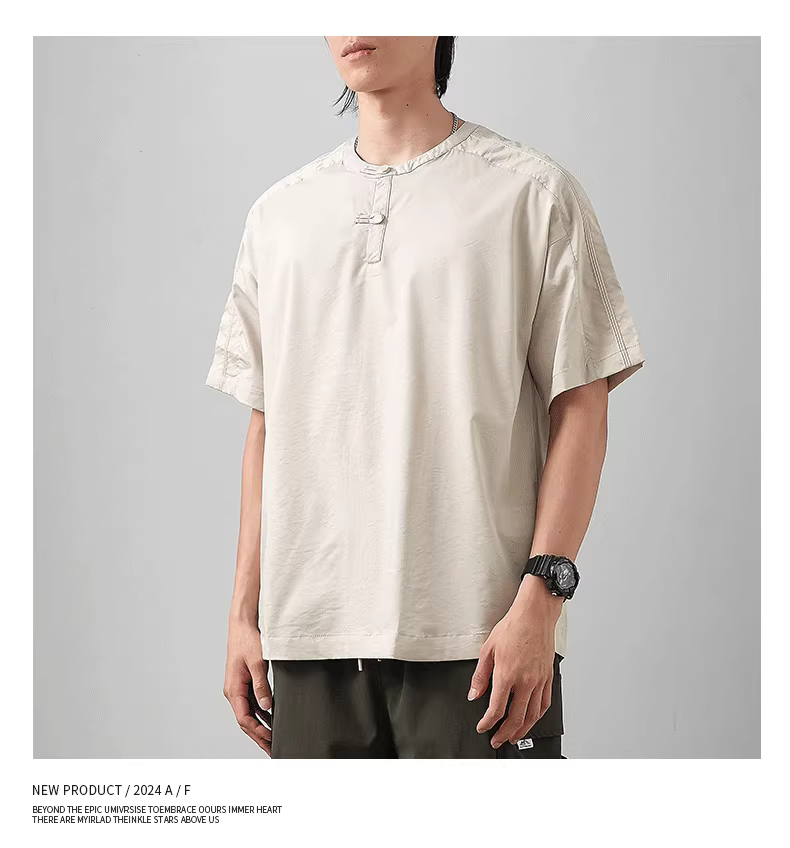 - Áo thun nam cài khuy kiểu Trung Quốc mới, tay ngắn, mẫu mới mùa hè, áo kiểu quốc gia cao cấp phong cách Đường, áo thun cổ Henry chất liệu lụa đá.