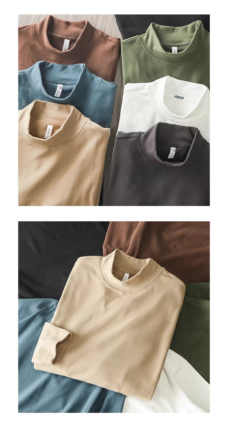 Áo thun nam chất liệu cotton nguyên chất, cổ cao nửa cổ, lớp lót giữ nhiệt cho mùa thu đông, lót lông cừu giữ ấm, màu trơn, áo thun dài tay dày 350G.