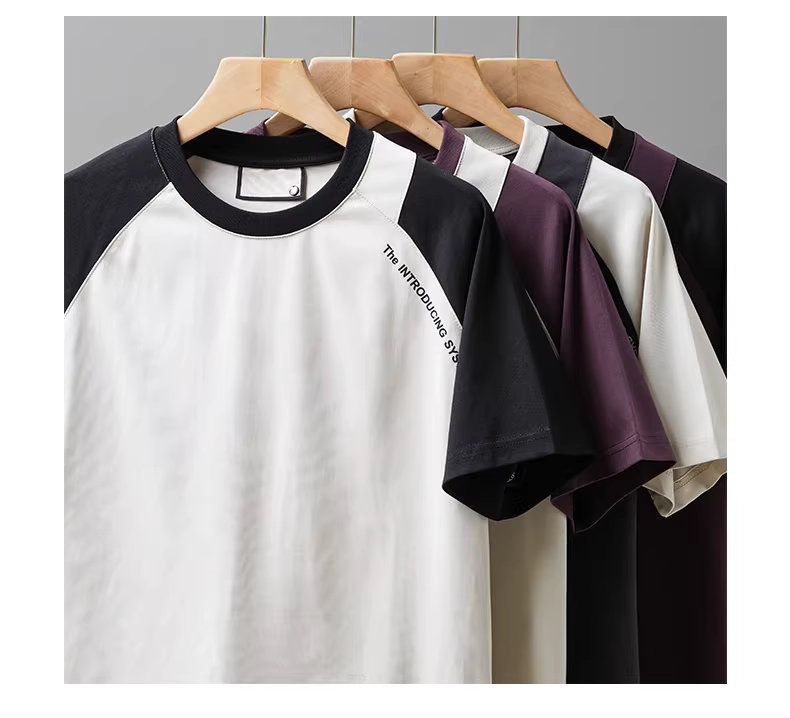 Áo thun nam chất liệu mát lạnh, tay ngắn, dáng rộng mặc mùa hè, cổ tròn, tay raglan, thiết kế phối màu, tay lửng.