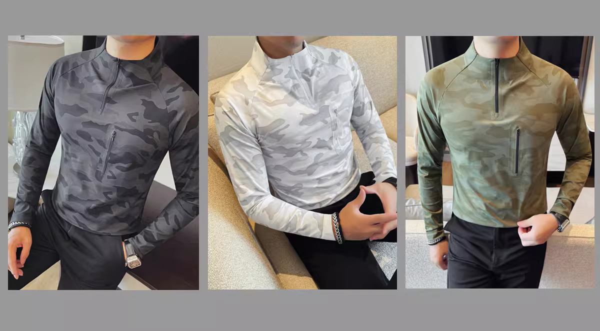 - Áo thun nam cổ đứng nửa cao khóa kéo chất liệu da cá mập, tay dài, kiểu mới thu đông 2025, ôm body co giãn cao, kiểu áo trơn màu rằn ri.