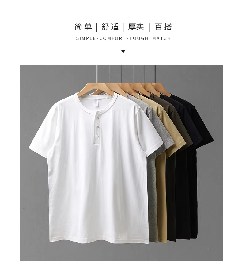 Áo thun nam cổ henley chất cotton 100% dày dặn 250G, tay ngắn, mùa hè, dáng rộng, cổ henley, phong cách Mỹ cổ điển, mạnh mẽ, màu trắng
