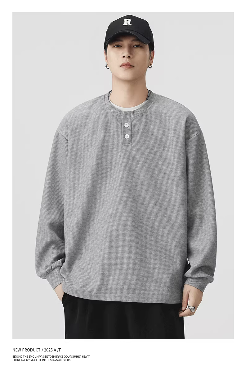 Áo thun nam cổ Henry chất liệu vải waffle dày dặn, kiểu dáng Mỹ mùa thu, áo len rộng rãi, áo thun dài tay mặc thường ngày, lớp áo lót.