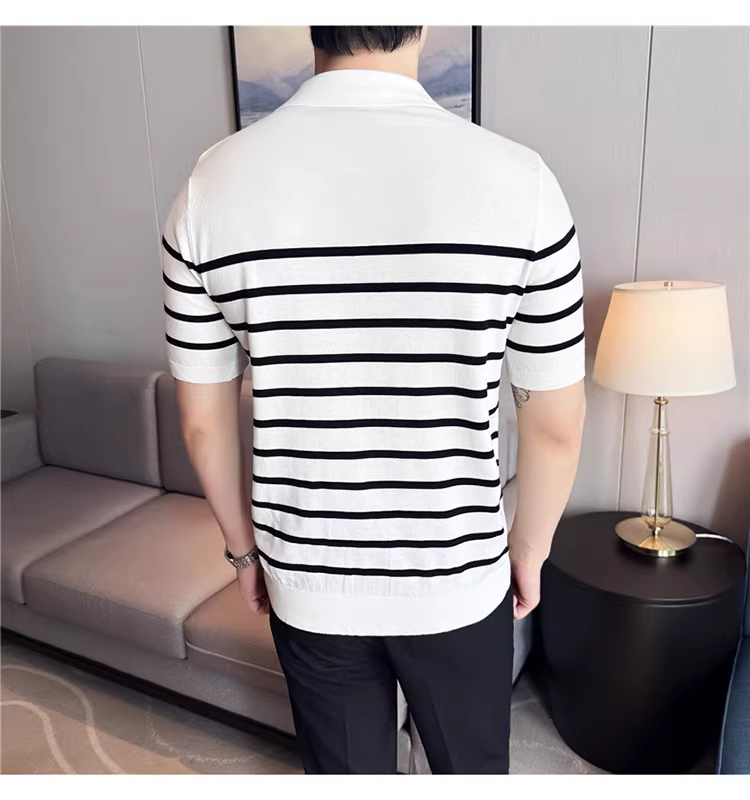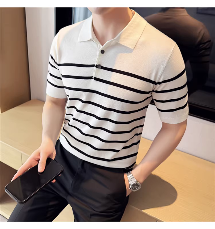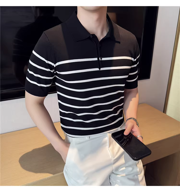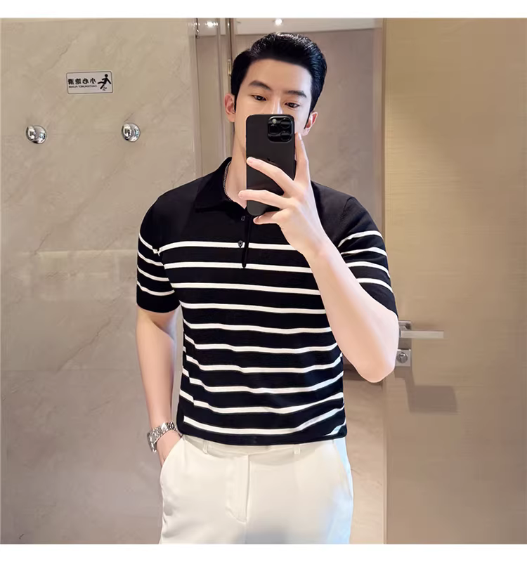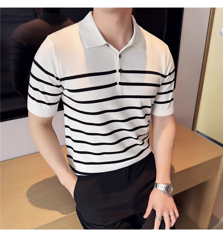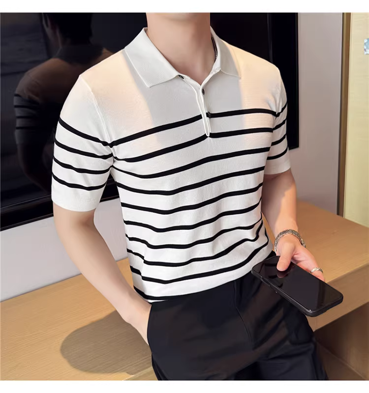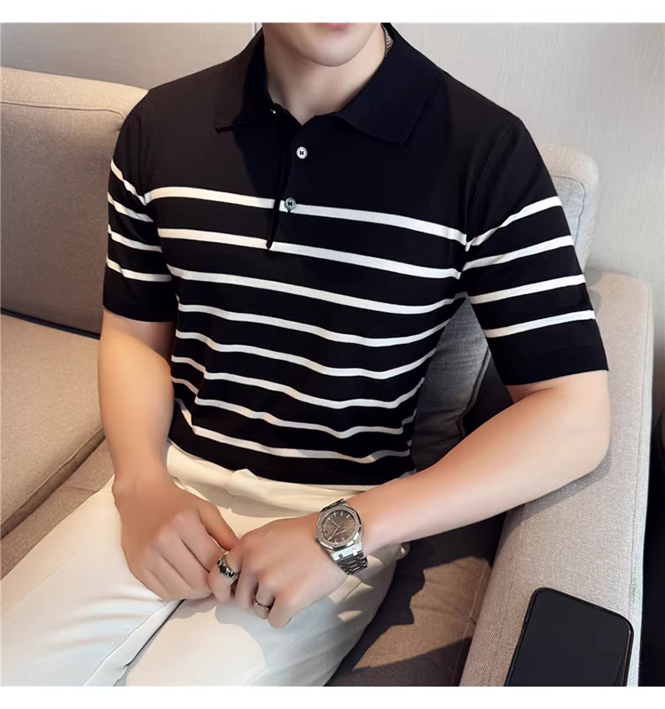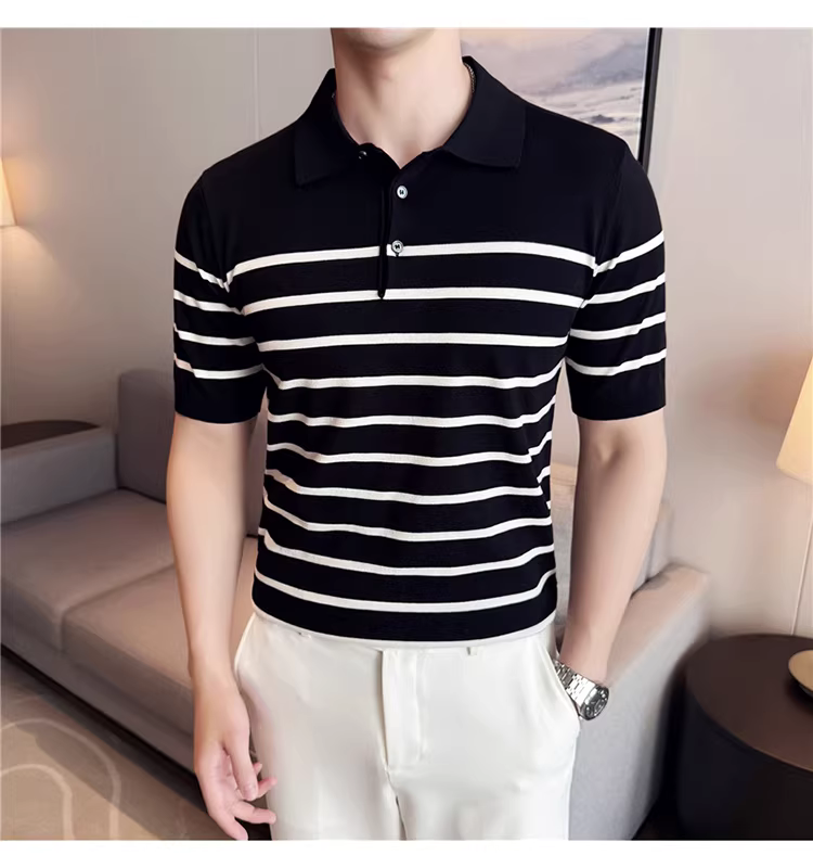 - Áo thun nam dệt kim phối màu sọc, cổ trụ, tay ngắn, kiểu mới hè 2025, chất liệu lụa đá cao cấp, phong cách công sở lịch lãm.