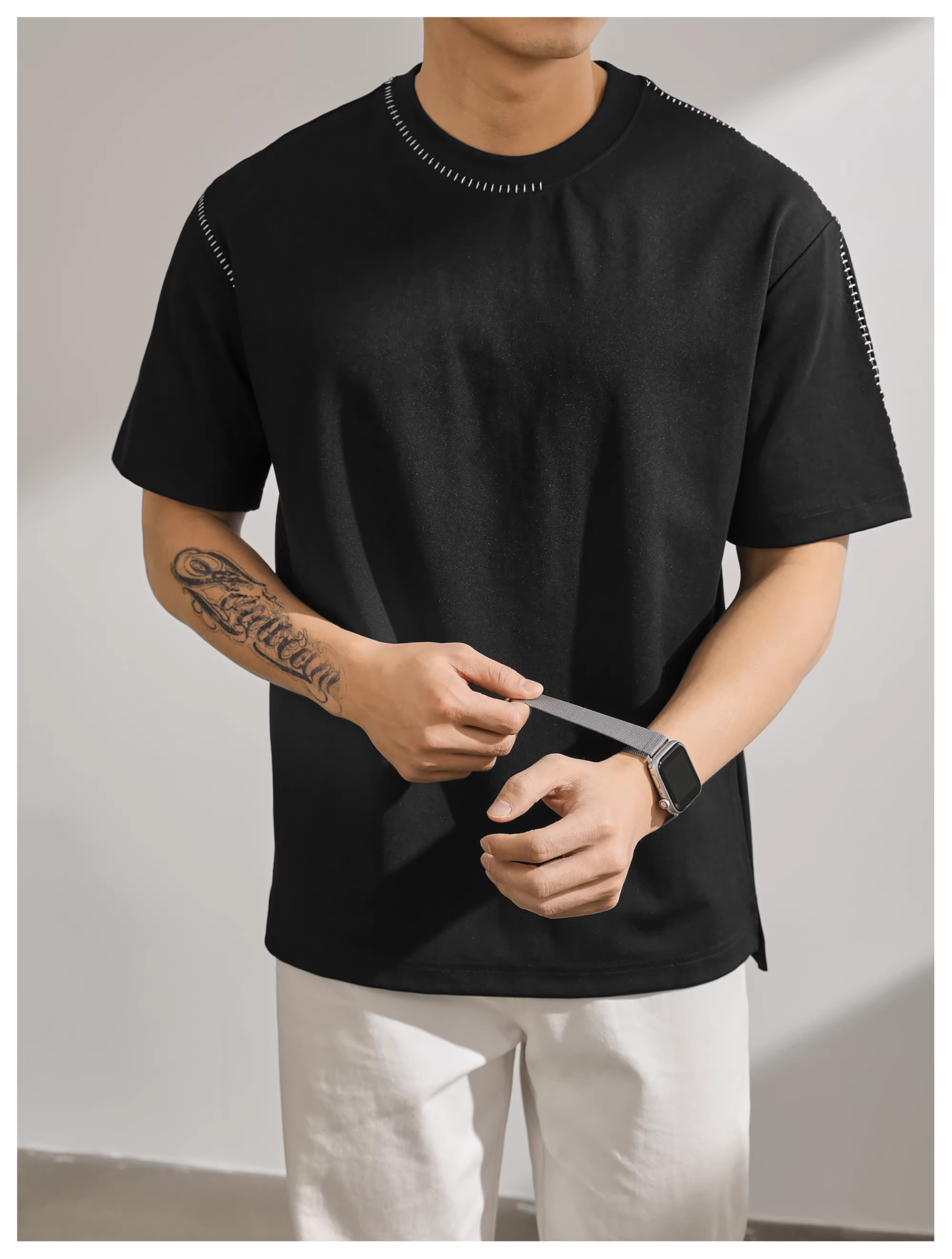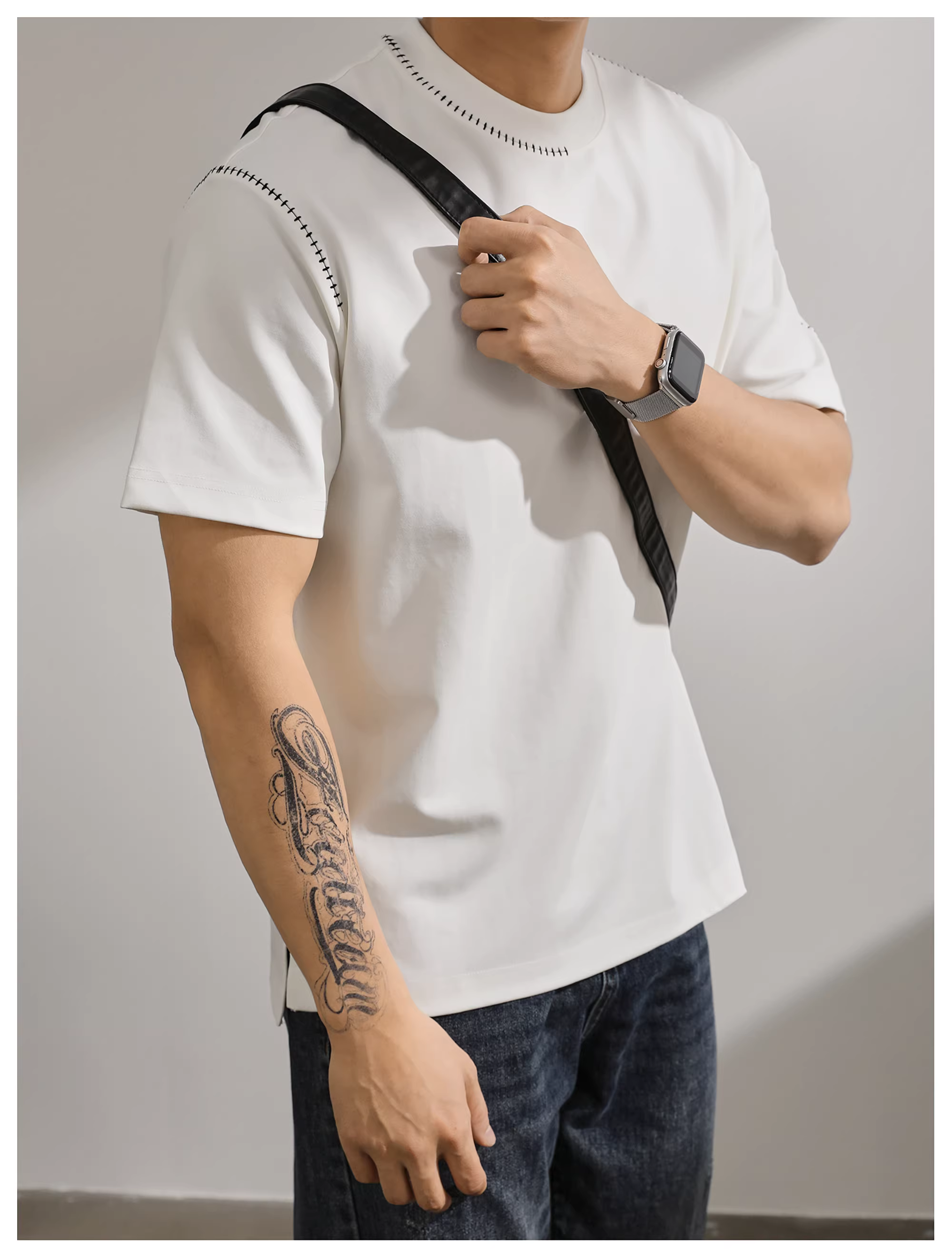 Áo thun nam LUUD 300G cao cấp nhẹ nhàng, phong cách retro, phối màu, đường may cổ áo, tay ngắn, dáng rộng, kiểu áo trễ vai, phong cách thường ngày, hơi rộng rãi