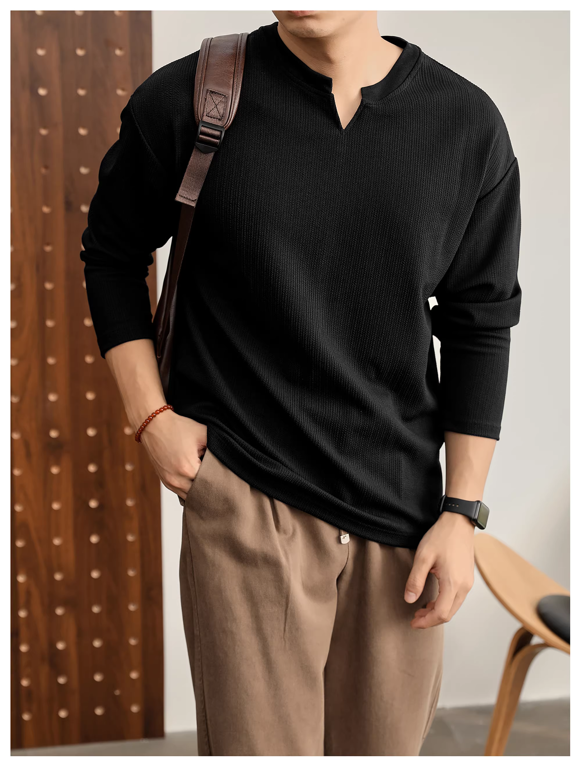 - Áo thun nam tay dài cổ V nhỏ, chất liệu jacquard cao cấp thiết kế xoắn độc đáo, phong cách tối giản, kiểu dáng áo len chui đầu.
