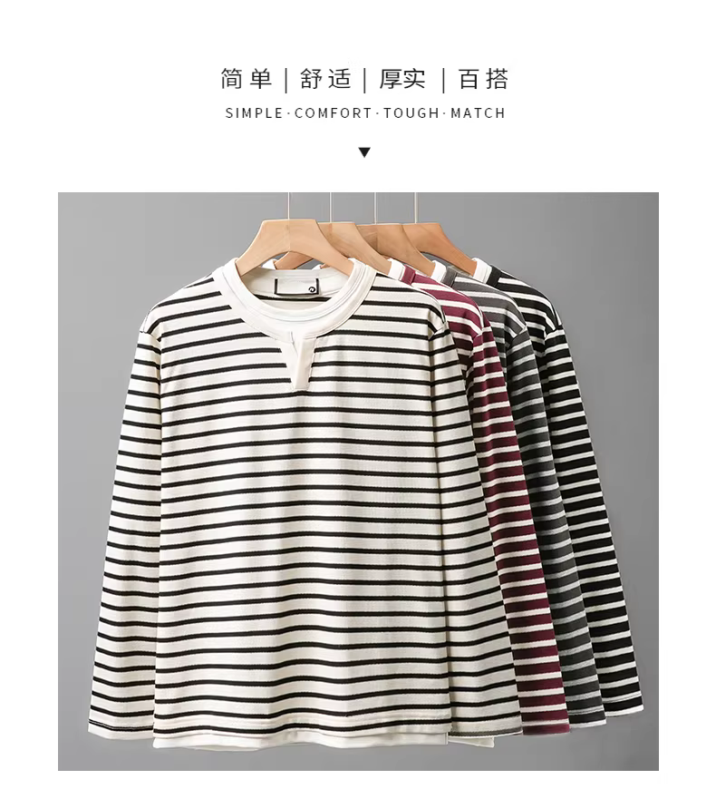 - Áo thun nam tay dài giả hai lớp chất dày, kiểu Mỹ, mùa xuân thu 2025, mới, cổ V, kẻ sọc, mặc lớp trong