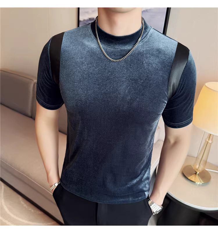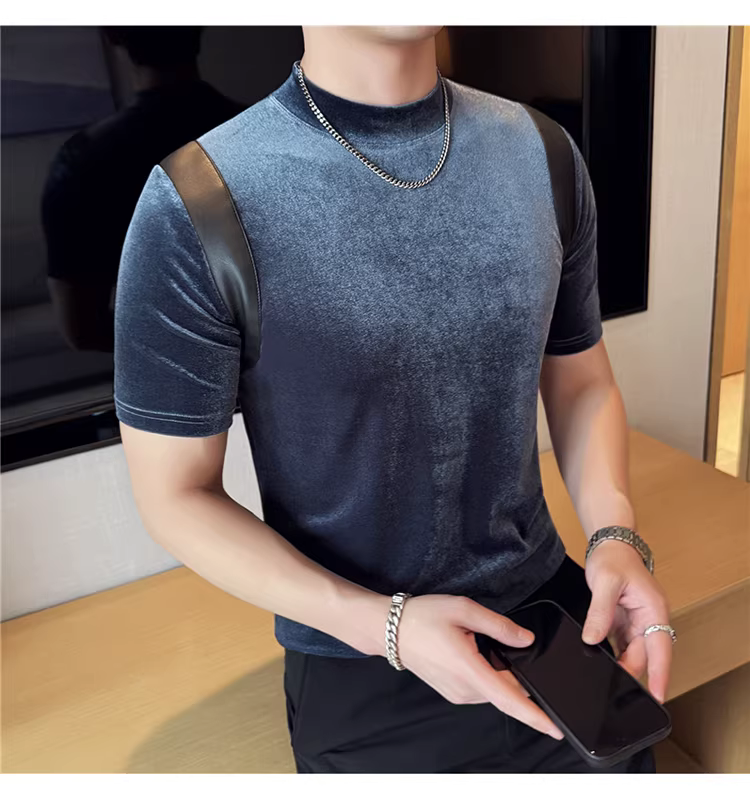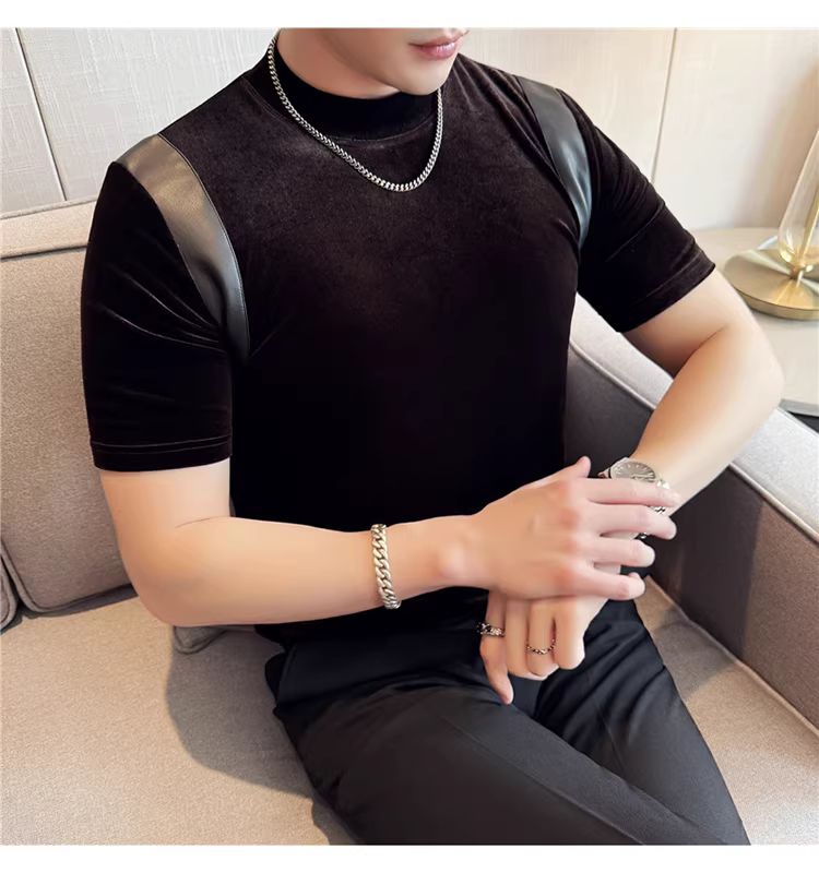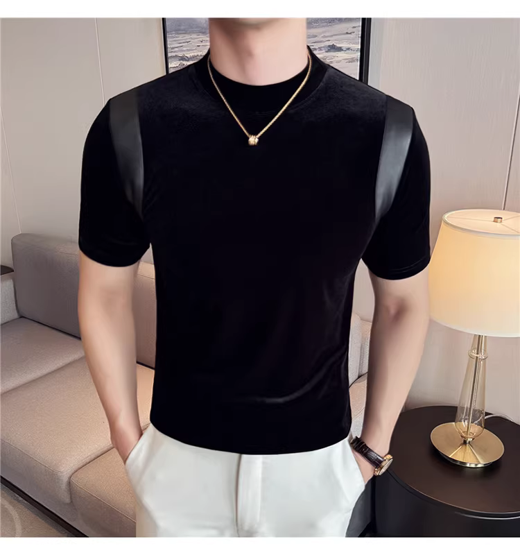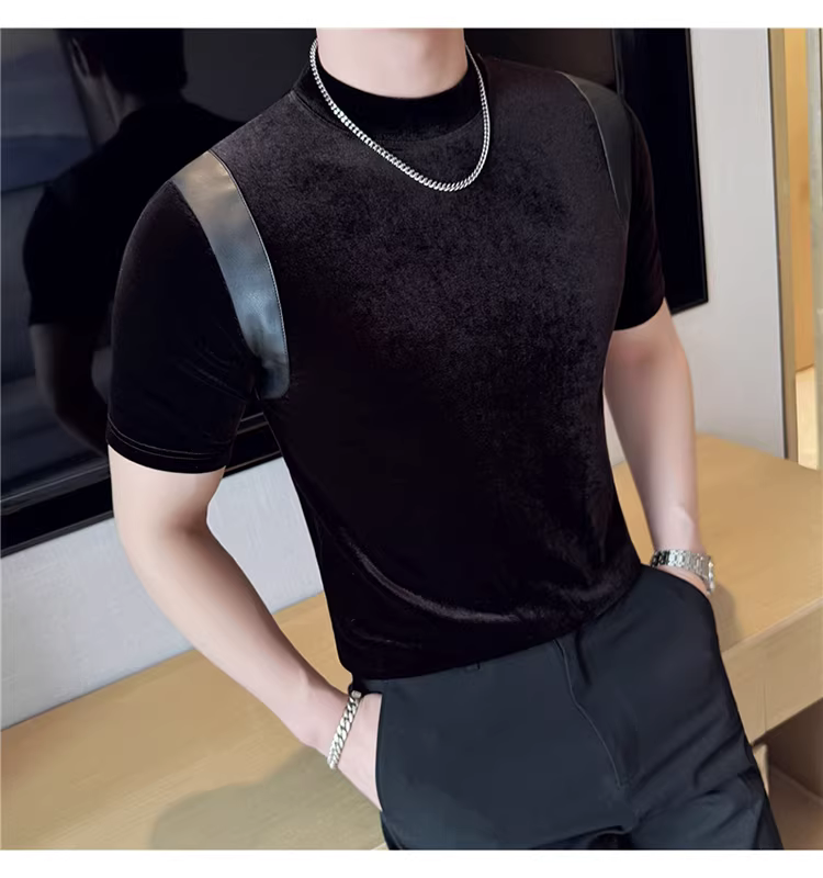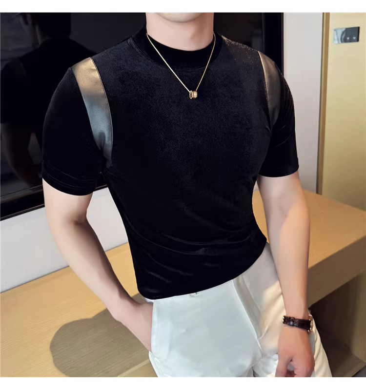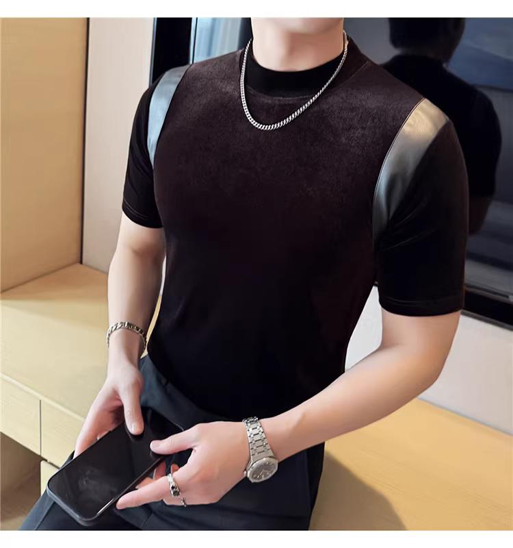 Áo thun nam tay ngắn cổ nhỏ phối da, thời trang xuân hè mới, áo lót ôm dáng cao cấp hợp xu hướng