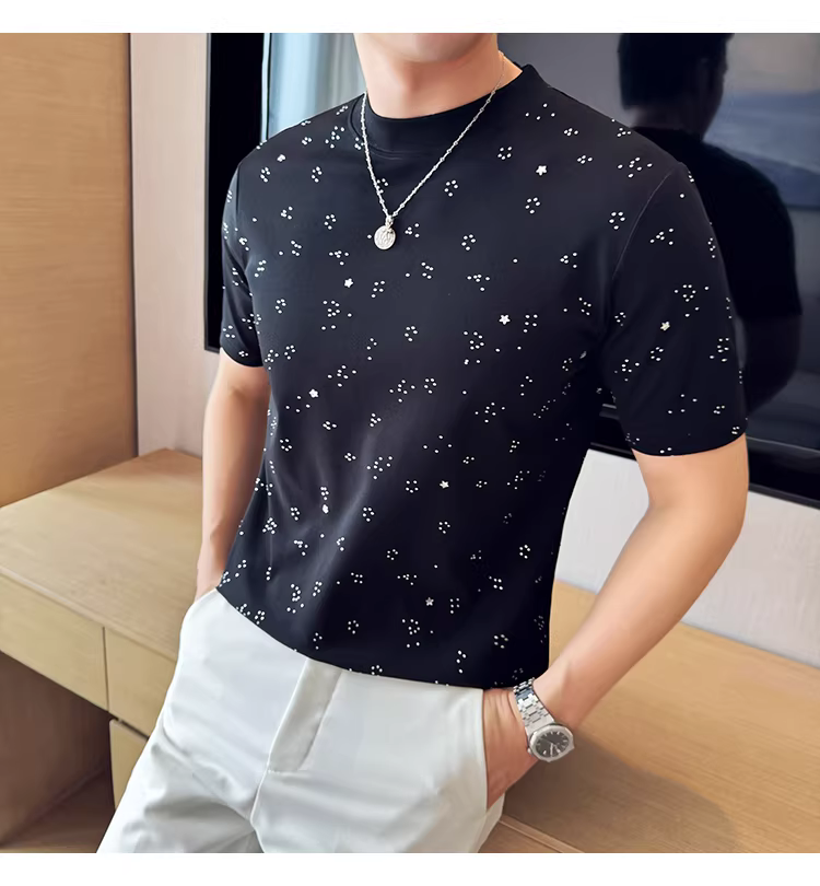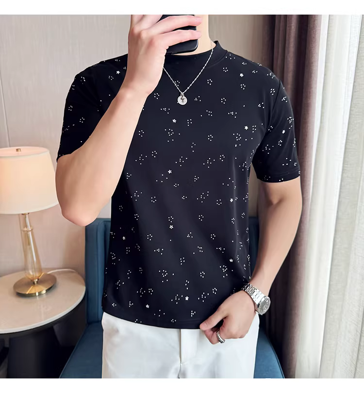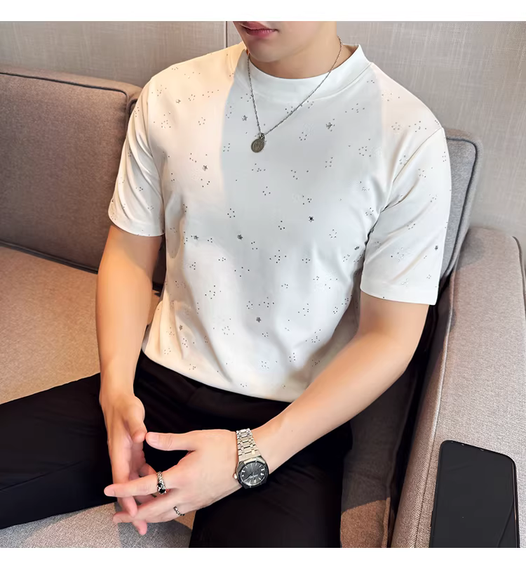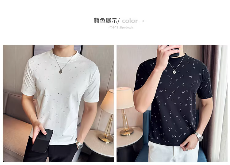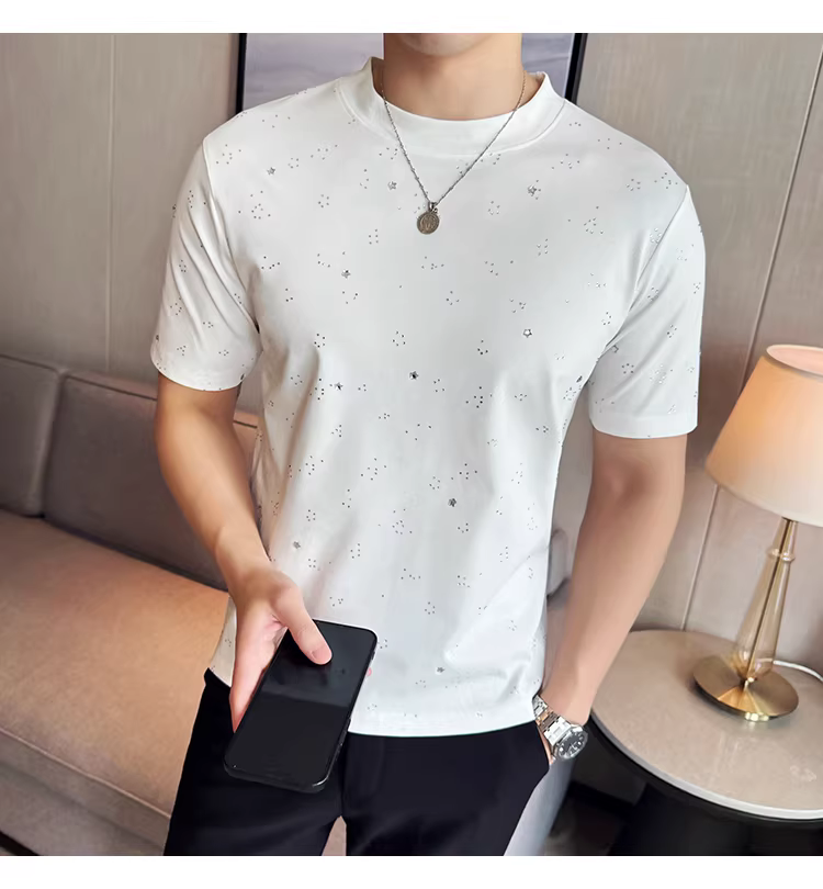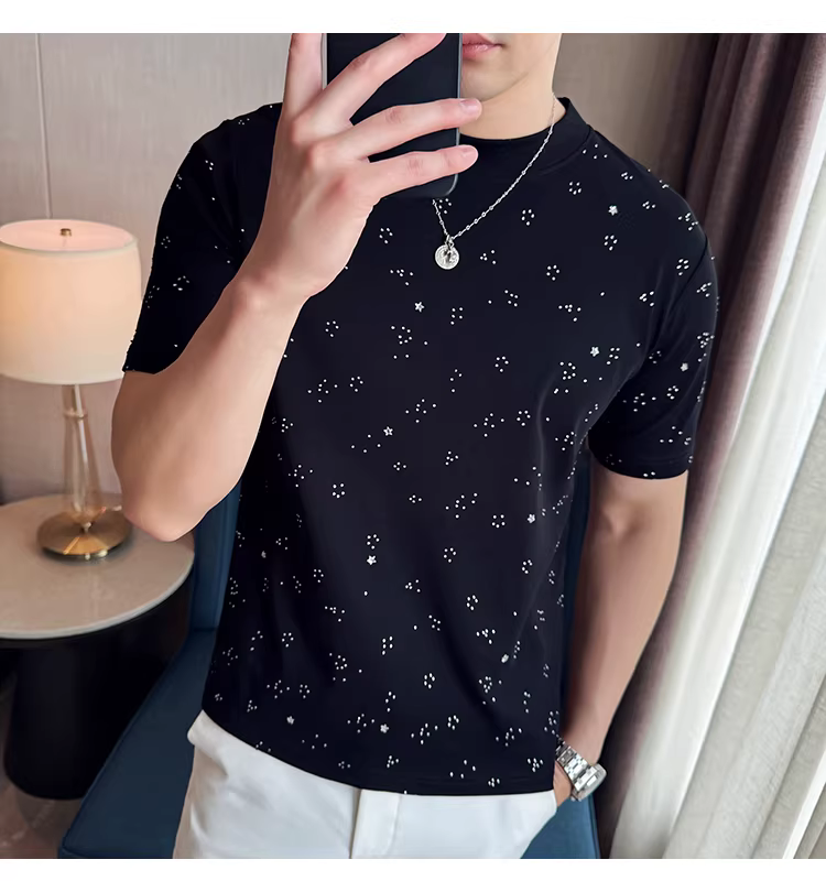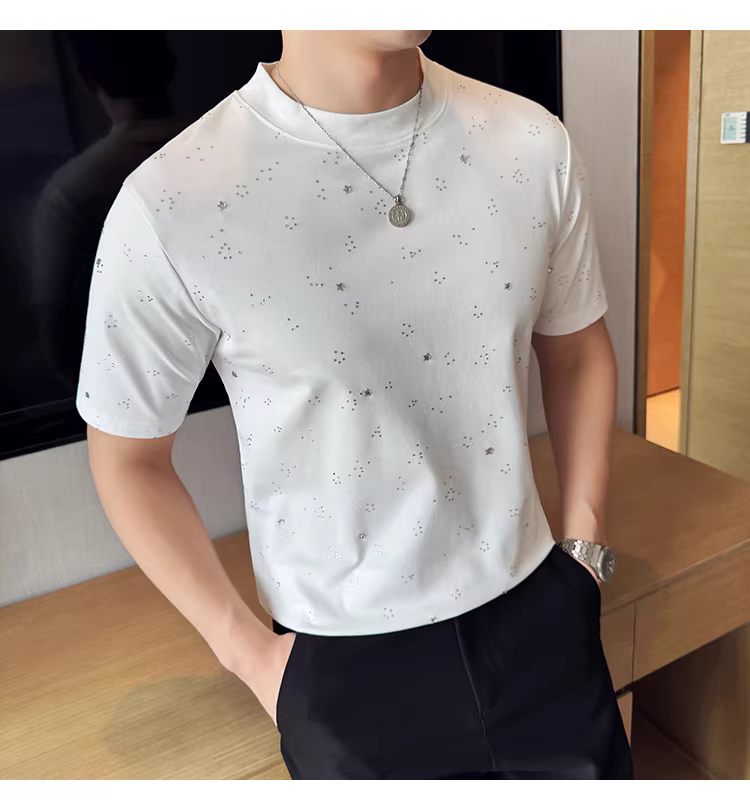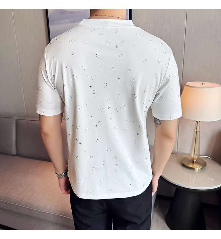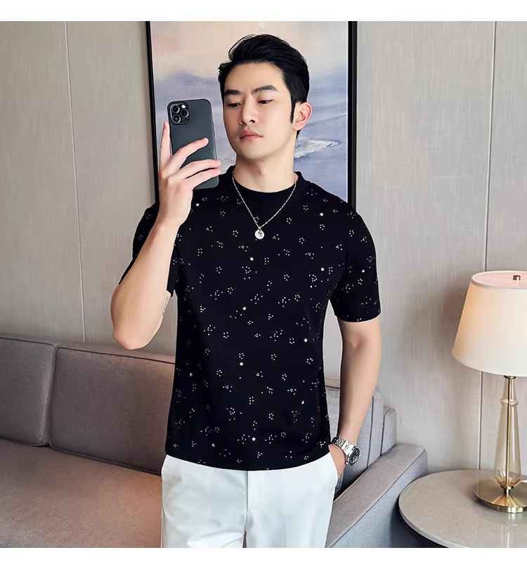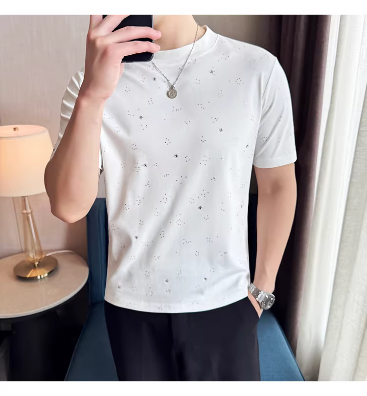 Áo thun nam tay ngắn cổ tròn thiết kế đính đá thời thượng, phong cách mùa hè mới, thời trang, co giãn, ôm dáng, đa năng.
