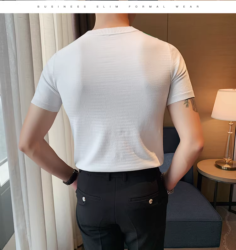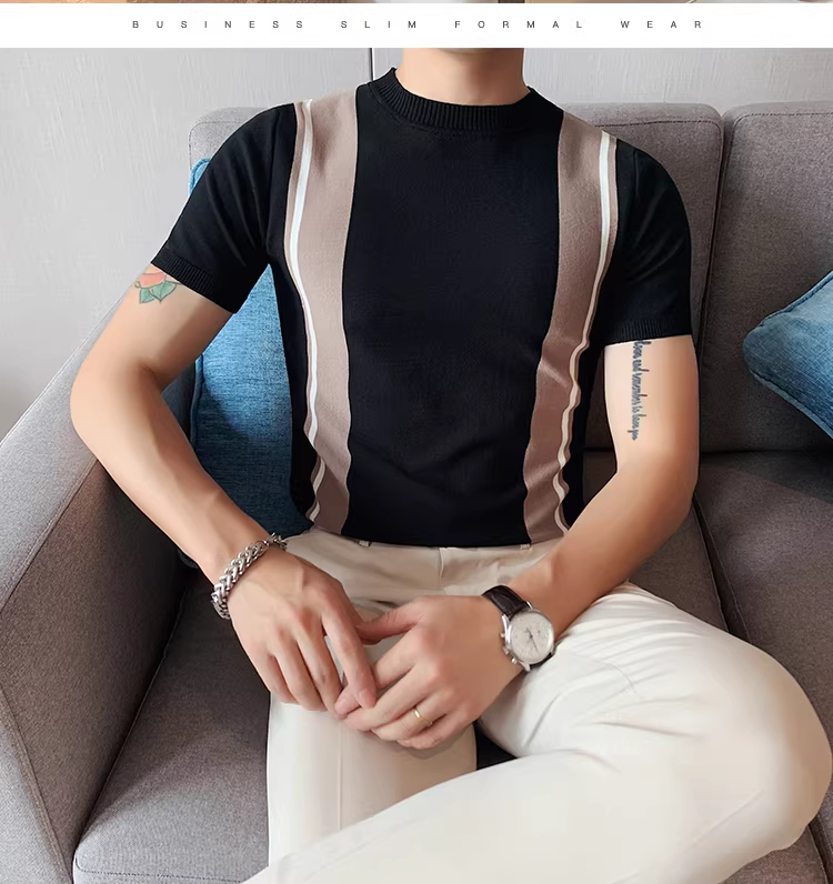 - Áo thun nam tay ngắn dệt kim mỏng như băng mùa hè, kiểu Hàn Quốc thời trang ôm dáng co giãn sọc phối màu